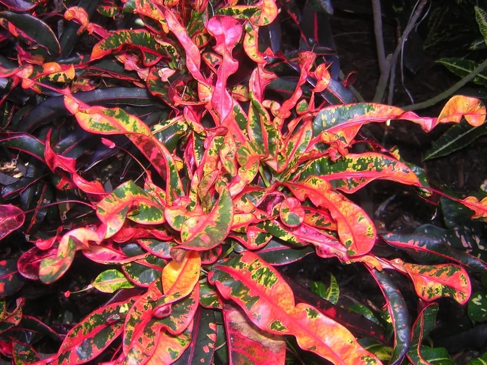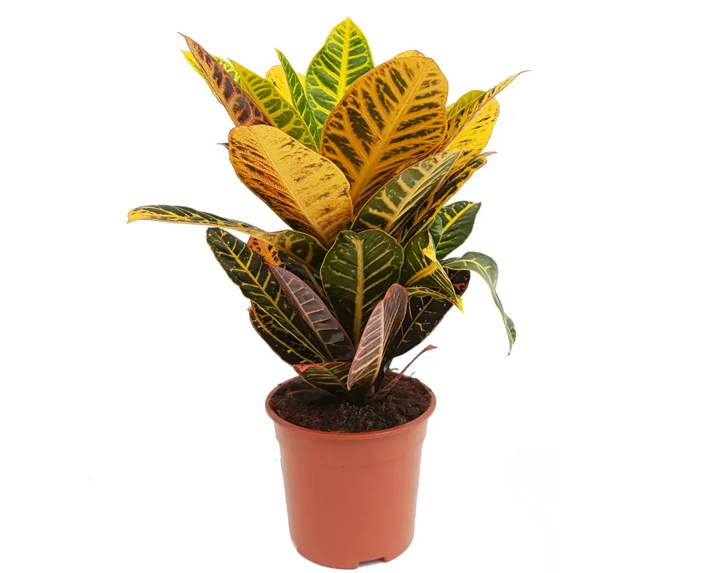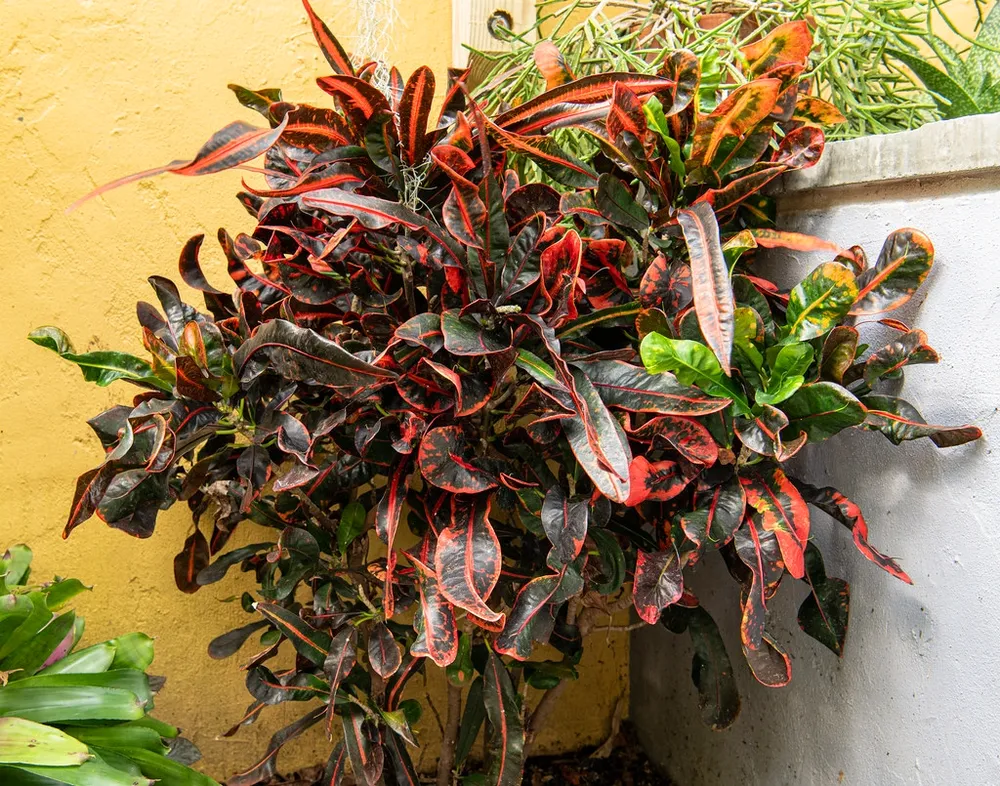 Кодиеум, или кротон (Codiaeum), принадлежит к семейству молочайных и считается одним из самых популярных комнатных растений благодаря своей декоративной листве. Родиной кодиеума являются тропические леса юго-восточной Азии и Австралии, где он растет в виде небольшого дерева или кустарника до 2-3 метров в высоту. В условиях комнаты растение остается компактным, достигая высоты около 1 метра. Листья кротона имеют разнообразную окраску: красный, оранжевый, желтый, зеленый, фиолетовый и даже белый.