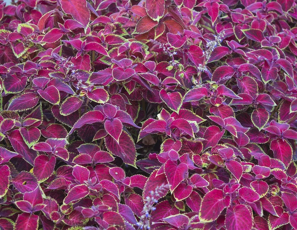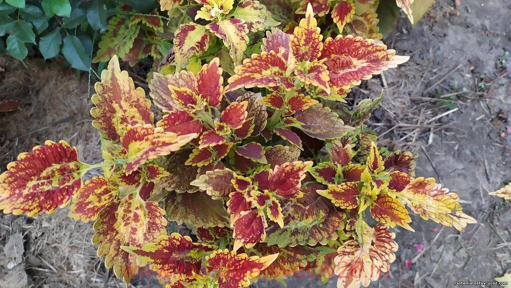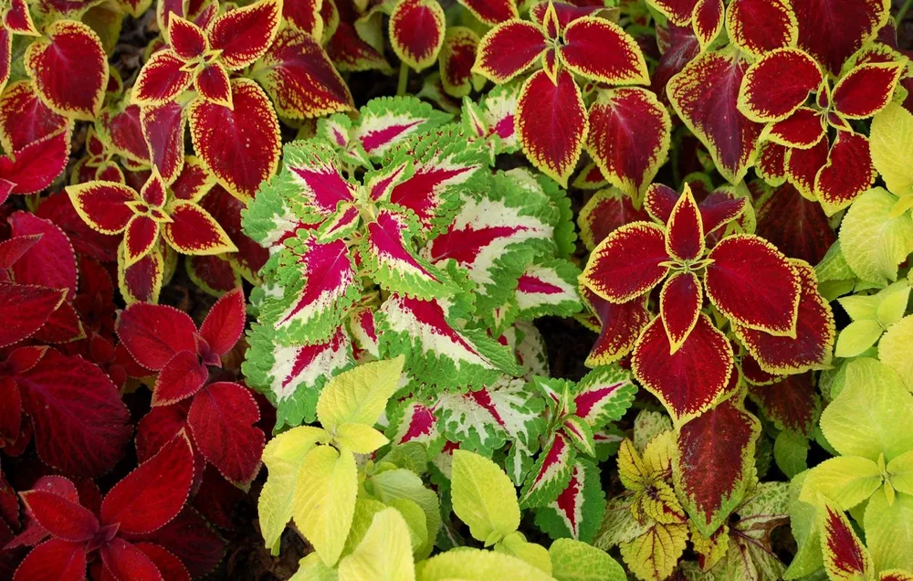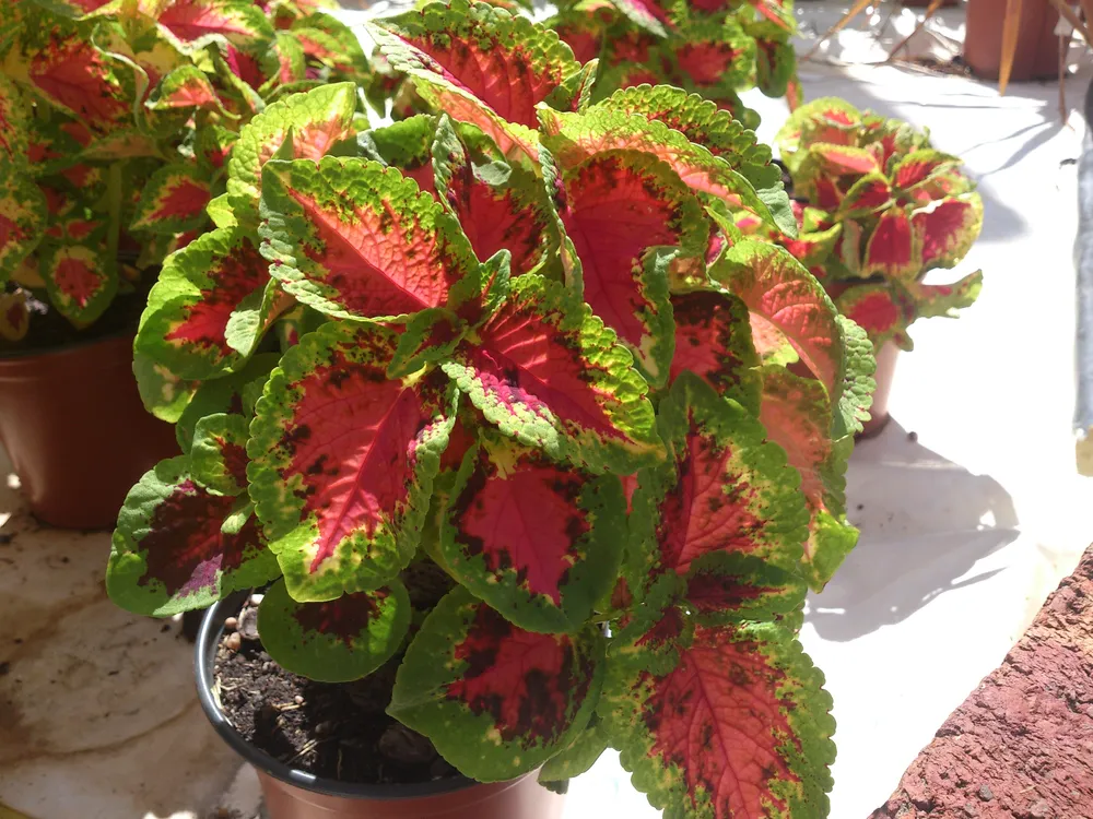 Колеус Тэррено пестрый выделяется среди других сортов своей особенной окраской. Листья его отличаются ярким контрастным рисунком, который создается благодаря сочетанию разных оттенков красного, розового, фиолетового и зеленого цветов. Сорт «Kong Rose» отличается более крупными листьями с розовыми прожилками, а «Wizard Purple’’ — более насыщенной пурпурной окраской. «Red Head» имеет яркие красные листья с белыми крапинками, а «Sunset’’ — оранжево-красную листву с желтыми пятнами.