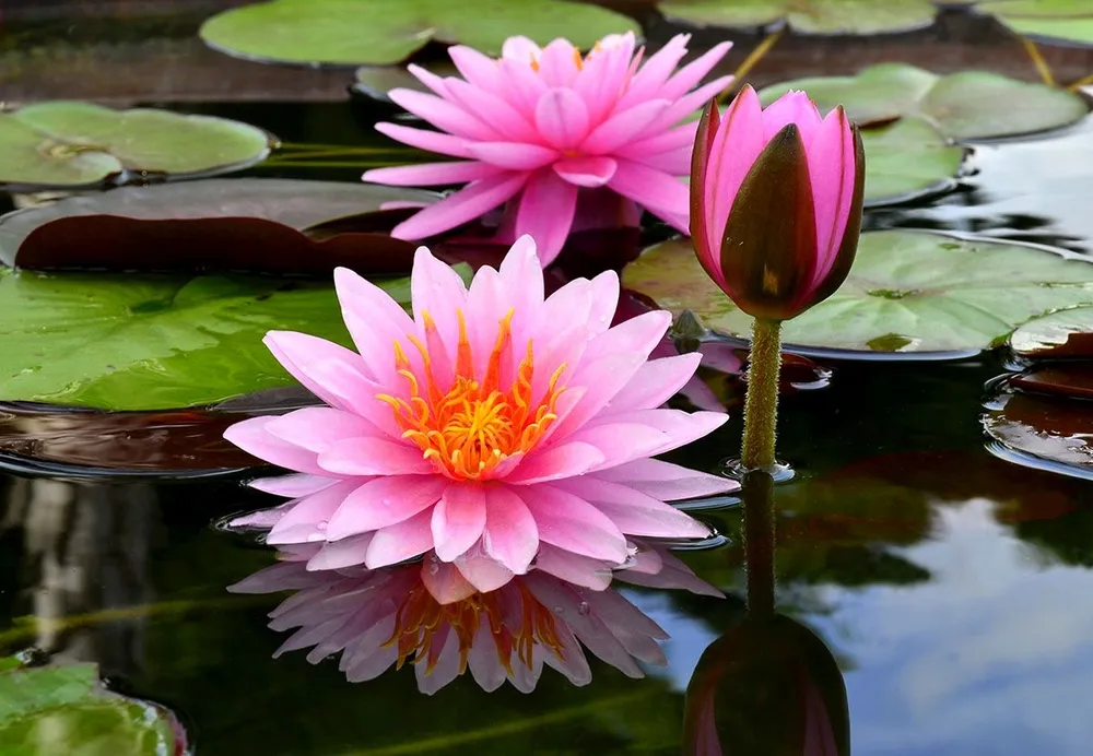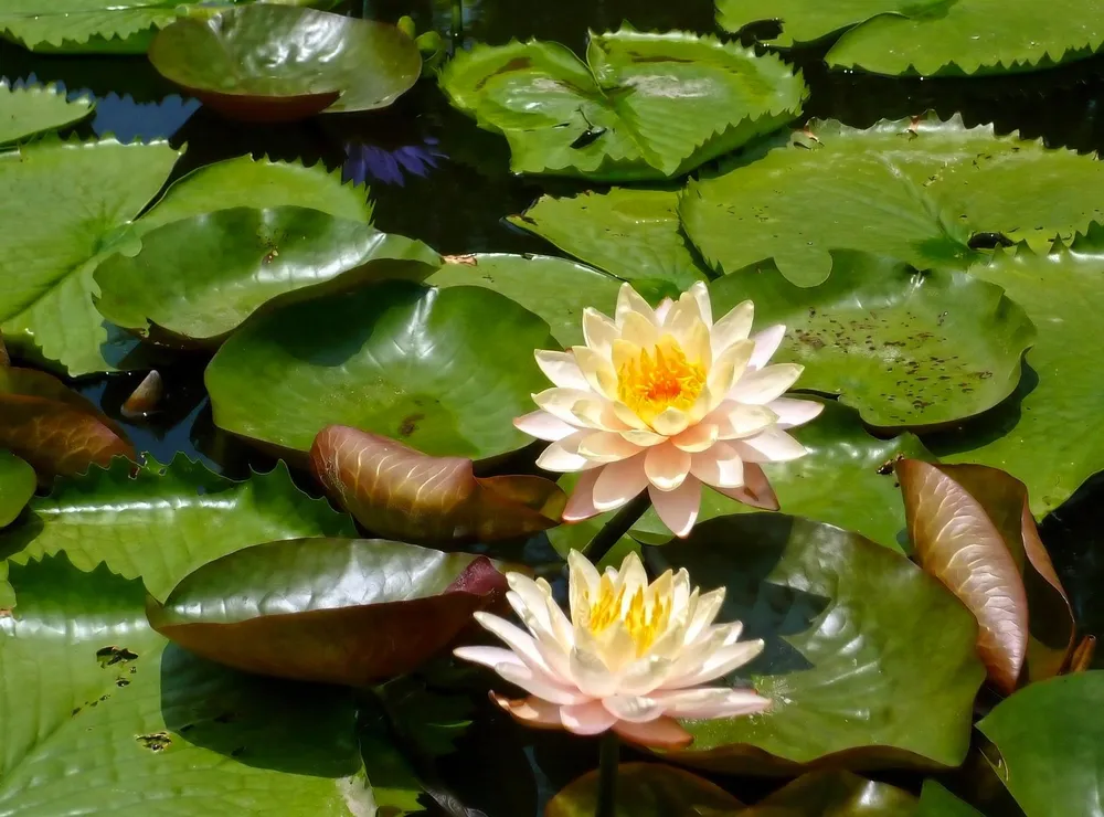 Nymphaea ‘Rosea’ — популярный сорт с розовыми лепестками, а Nymphaea ‘Blue’ отличается необычным сине-фиолетовым окрасом цветков.