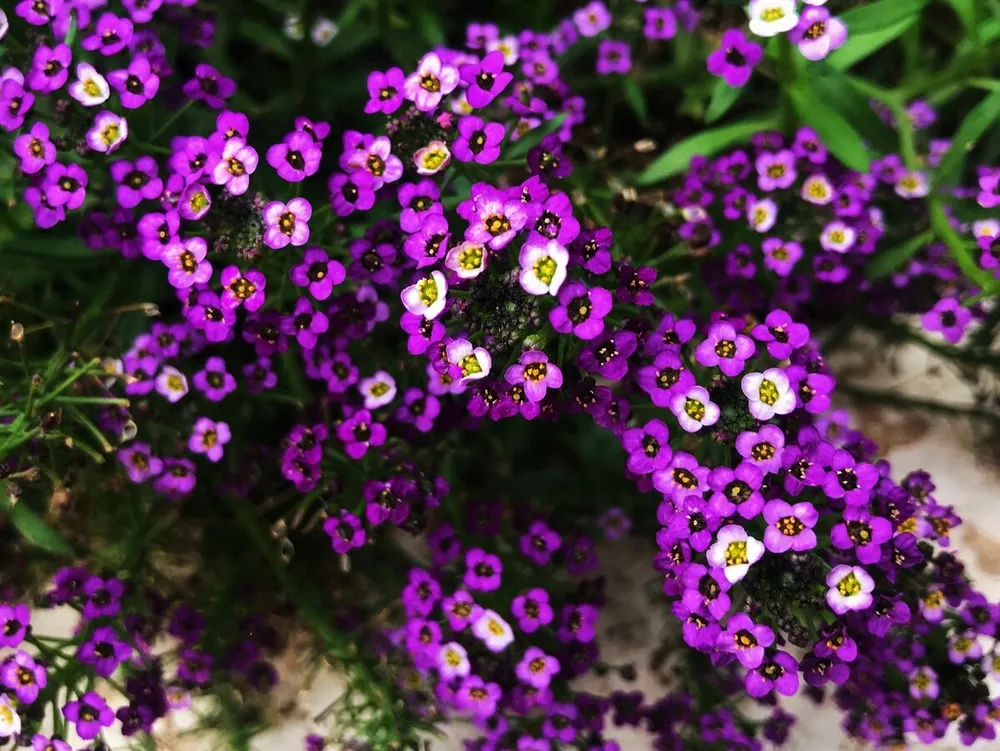 Лобулярия Восточные ночи отличается от других сортов более насыщенным фиолетовым окрасом и серебристыми прожилками на листьях.