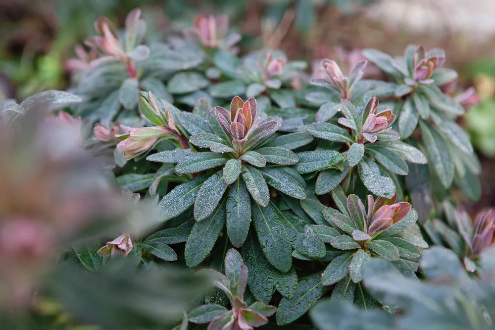 Молочай миндалевидный ‘Пурпурея’ — это эффектный и неприхотливый кустарник, который украсит любой сад своим пышным цветением и необычной окраской листьев. Его привлекательность заключается в сочных пурпурных соцветиях на фоне темно-зеленых листьев с серебристым отливом, что создает яркий контраст и придает саду экзотичный вид. Молочай миндалевидный ‘Пурпурея’ относится к семейству Молочайных и является одним из самых популярных сортов в культуре благодаря своей неприхотливости и долговечности. Родом он из Южной Африки, где произрастает в сухих и засушливых районах. Именно эти условия сформировали у него высокую устойчивость к засухе и жаре, что делает его идеальным выбором для регионов с жарким климатом.