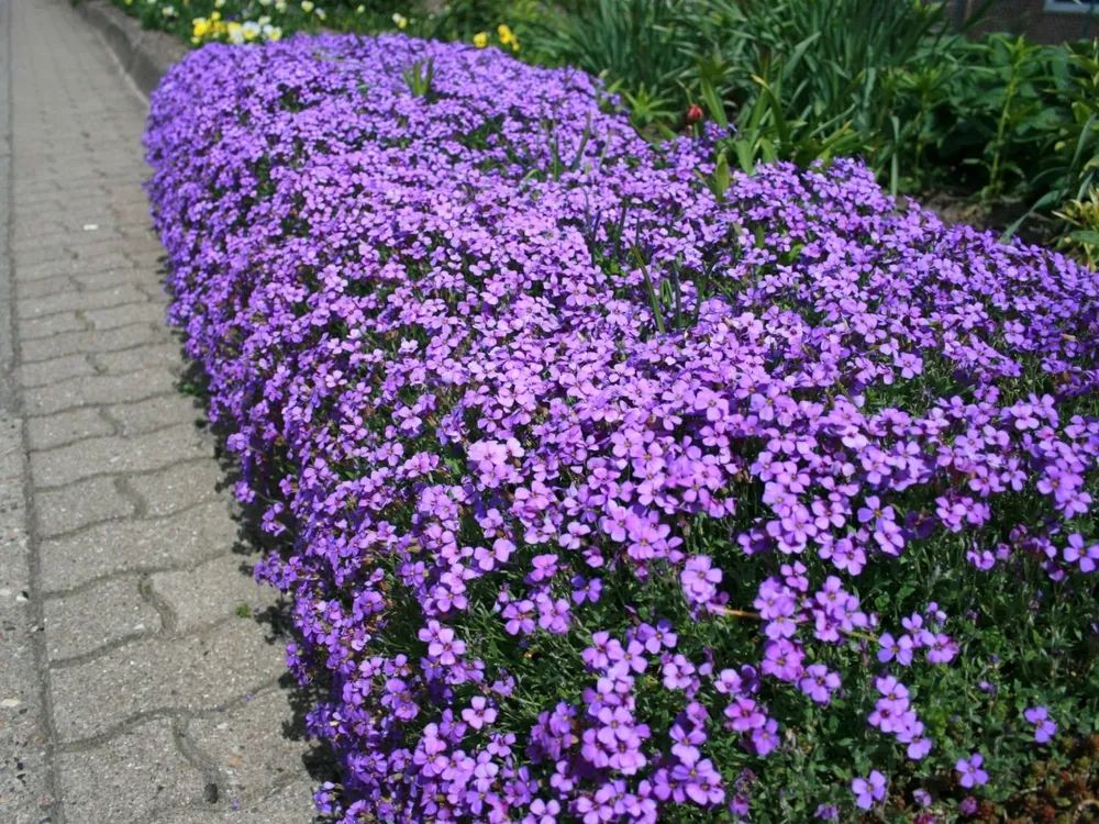 Обриета Синий каскад — это многолетний кустарник, который покоряет своей изысканностью и красотой. Его насыщенно-голубые цветки, напоминающие мелкие колокольчики, создают эффект бесконечного потока синего, переливаясь в солнечных лучах. Этот сорт был выведен селекционерами относительно недавно, но уже успел завоевать популярность среди любителей садоводства за свою неприхотливость и декоративность. Синий каскад отличается своей компактной формой — куст обычно не превышает 60-70 см в высоту и ширину. Это делает его идеальным вариантом для оформления альпийских горок, бордюров, контейнерных садов и даже вертикальных садов. Благодаря обильному цветению, который продолжается с конца весны до осени, Синий каскад способен стать ярким акцентом в любом ландшафтном дизайне. Уход и выращивание обриеты Синий каскад #Освещение: Обриета Синий каскад предпочитает солнечные места с достаточным количеством света — не менее 6 часов в день. В полутени куст может расти, но цветение будет более скудным. #Почва: Для полноценного развития Обриете Синий каскад необходима хорошо дренированная почва с нейтральной или слабокислой реакцией (pH 6.0-7.0). Добавление органических веществ в виде компоста или перегноя улучшит структуру почвы и обеспечит достаточное количество питательных веществ. #Полив: Обриета Синий каскад нуждается в регулярном поливе, особенно в период активного роста и цветения. Поливать следует обильно, до тех пор пока вода не проникнет глубоко в землю. В засушливые дни рекомендуется увеличивать частоту поливов. Однако важно избегать переувлажнения почвы, так как это может привести к загниванию корней. Определить необходимость полива можно путем прикосновения к верхнему слою грунта. Если он уже высох на пару сантиметров, то пора снова поливать.