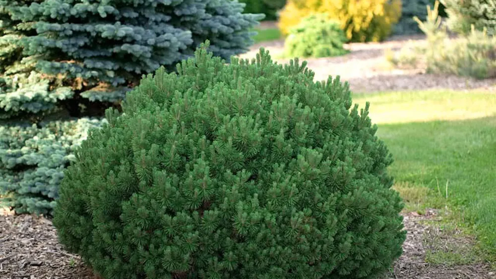Например, сосна Pinus mugo ‘Nana’ также является карликовым сортом, но ее крона более раскидистая и менее густая.