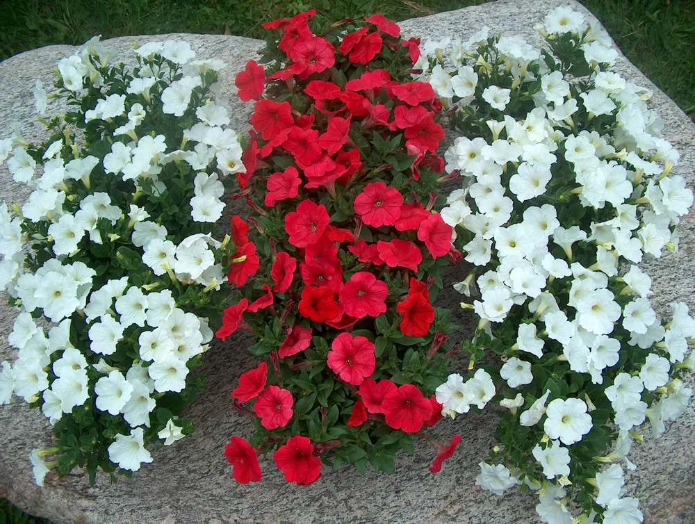 Петуния Красная с белым имеет компактный кустик и обильное цветение, благодаря чему создаёт густые и пышные ковры из цветков. Это растение очень популярно среди садоводов благодаря своей неприхотливости в уходе и длительному периоду цветения, который может продолжаться до самых заморозков.