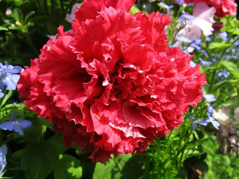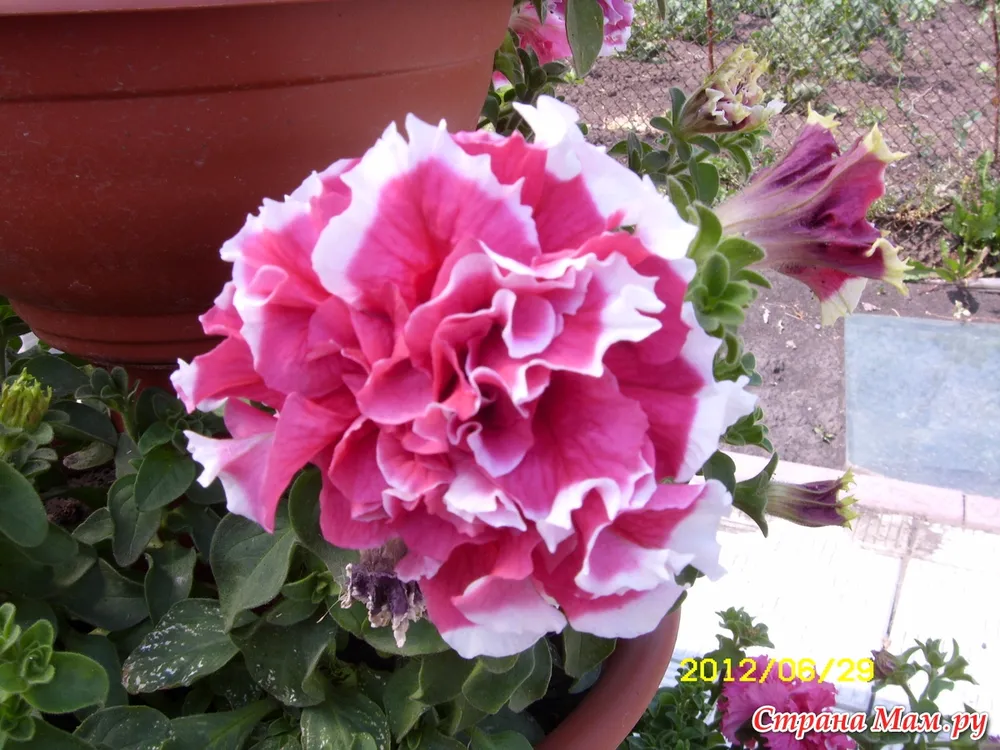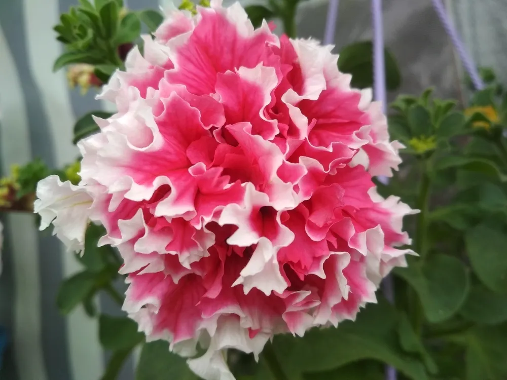 - Петуния Пируэт красный с белым махровый отличается более крупными цветами, чем большинство других ампельных сортов.