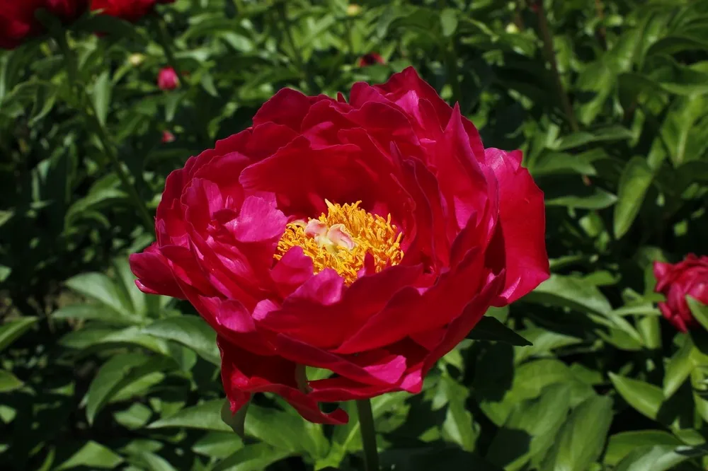Бакай Белл выделяется среди других сортов пионов своей уникальной цветовой гаммой. Его насыщенно-красные лепестки с белыми краями создают неповторимый контраст, который делает его поистине эксклюзивным.