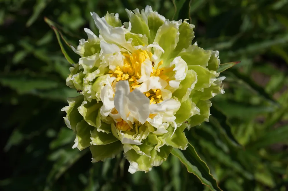 Этот сорт относится к группе травянистых пионов. Его главная особенность – двутонные махровые цветки необычного оттенка. Основной тон лепестков – глубокий насыщенный зеленый, который плавно переходит в изумрудный на верхушке. В центре цветка располагается пышный каплевидный центр ярко-золотистого цвета. Крона цветка округлая, махровая, диаметром достигающая 15-20 см.