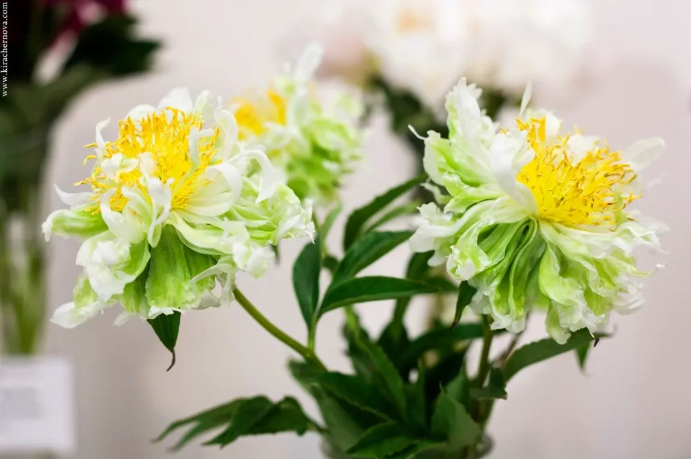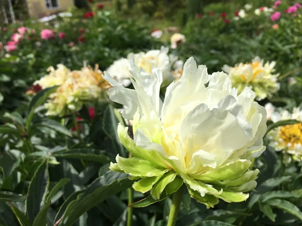 Пион Грин Хэло выделяется среди других сортов пионов своей необычной окраской и махровыми цветками. Он похож на сорт ‘Emerald Ruffles’ по форме и размеру цветка, но отличается более насыщенной зеленой гаммой.