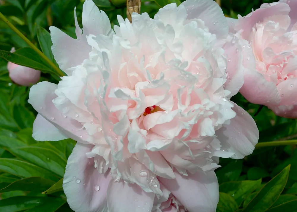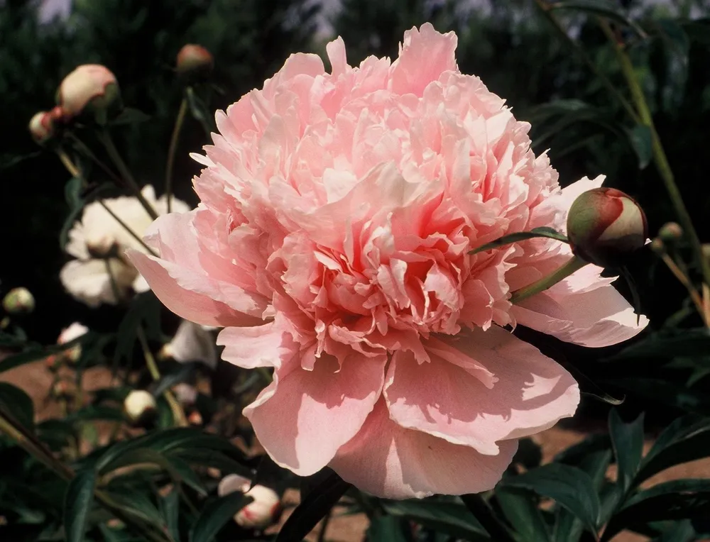 Пион Мэри Джо Легар отличается своей уникальной окраской цветков – мягким розовым оттенком с белыми краями.