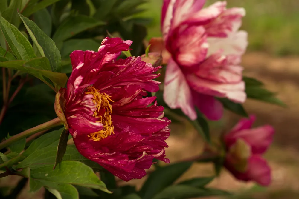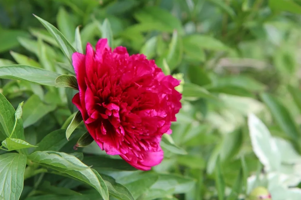 Пион Ноузгей выделяется среди других сортов своей уникальной окраской листьев.