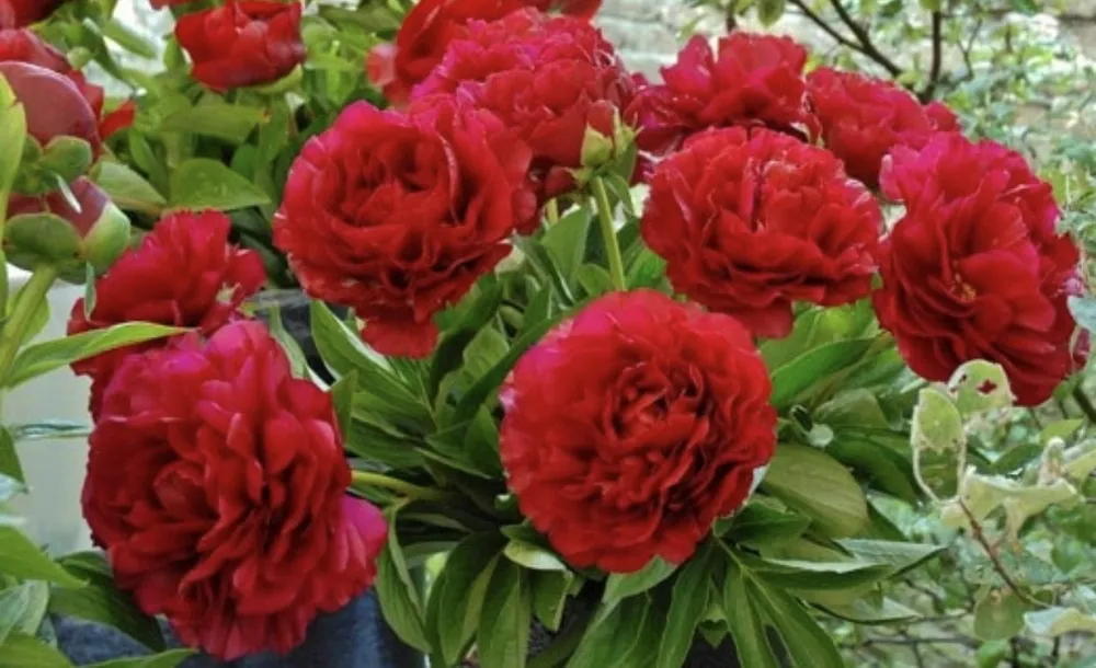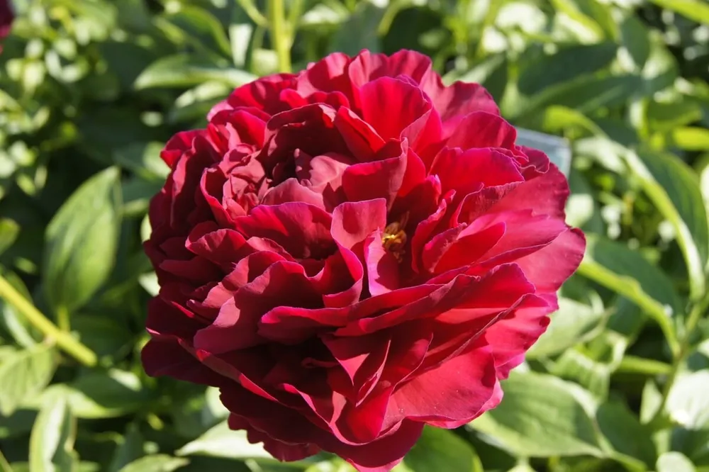 Пион Ред Сара Бернард выделяется среди других сортов своей яркой красно-бордовой окраской лепестков.