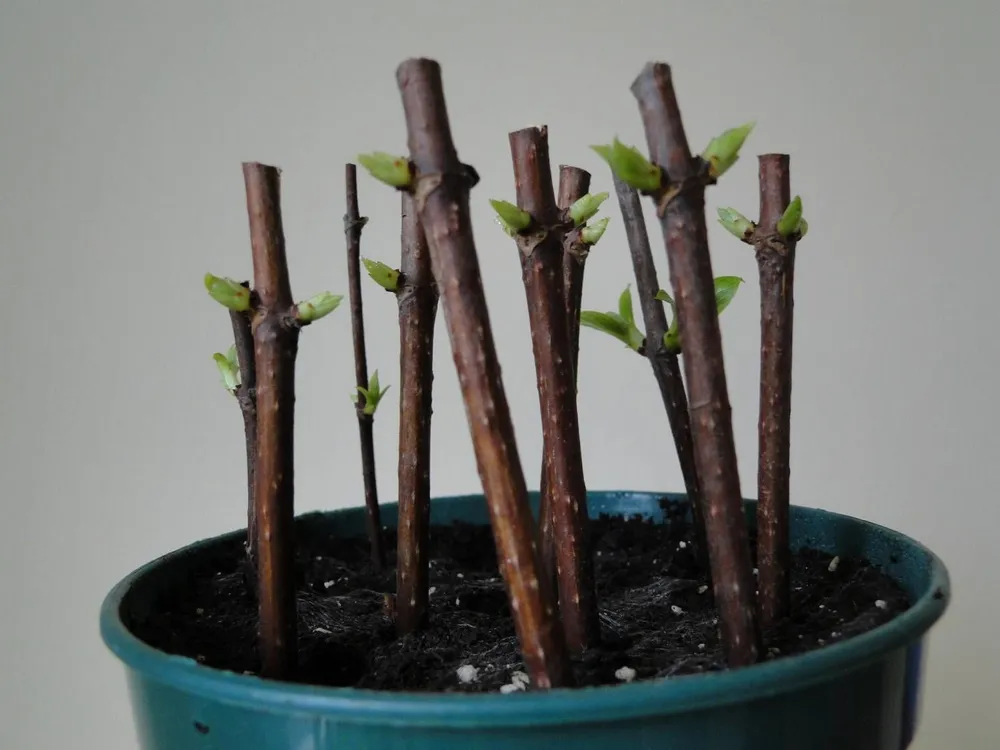 - Подготовка черенков: Для черенкования лучше всего подходят полуодревесневшие или одревесневшие черенки длиной 10-15 см, которые следует срезать в весенний период. Отрезайте здоровые побеги без цветков и бутонов.