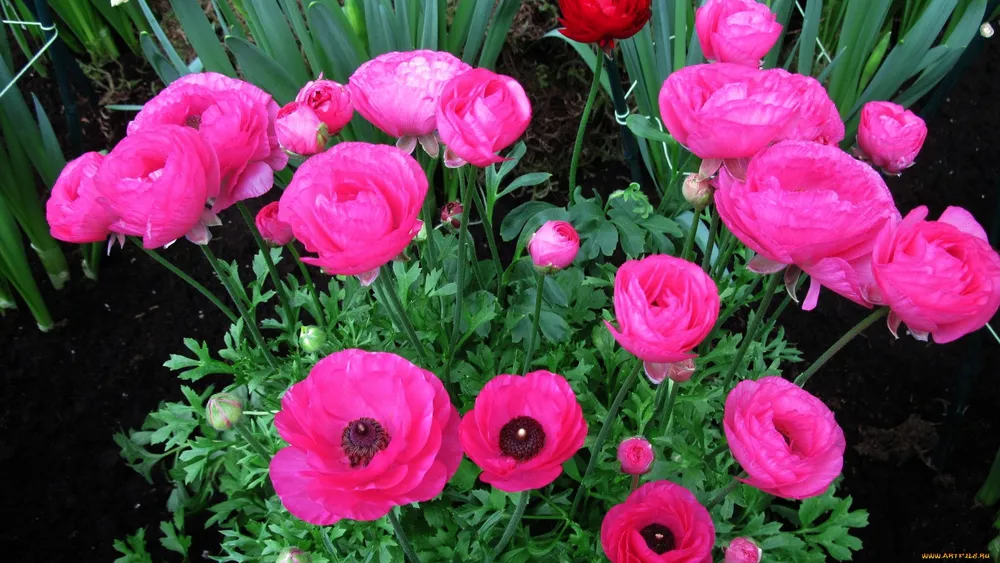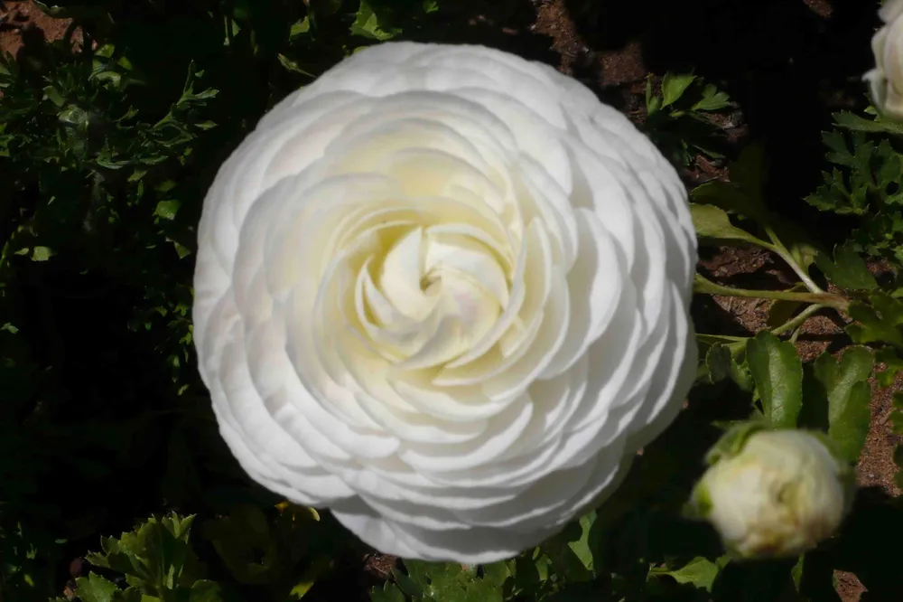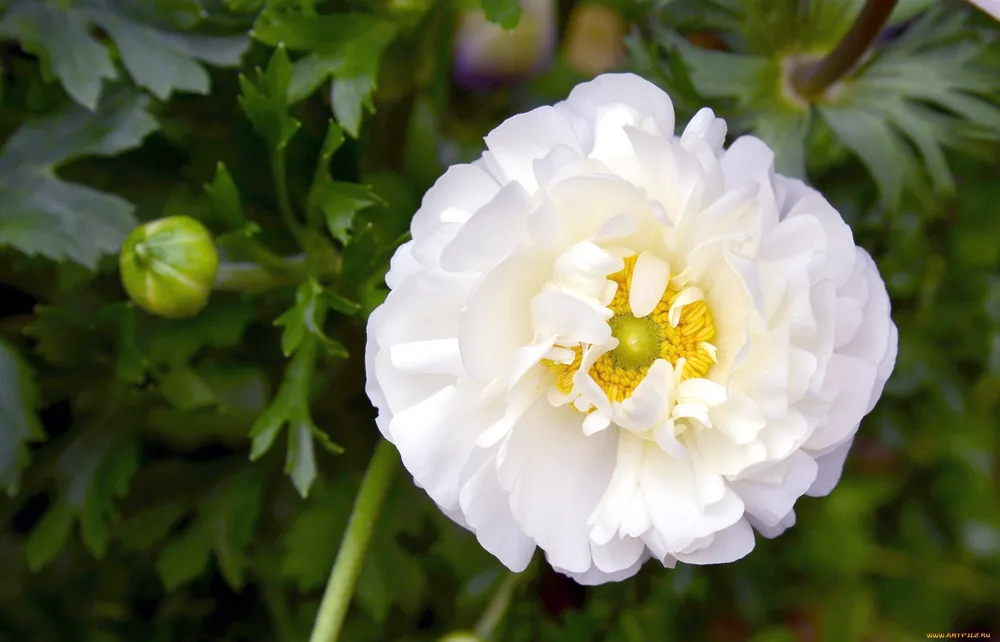Ранункулюс Цветущая долина белая выделяется среди других сортов своей белоснежной окраской цветков и густой листвой. Сорта с розовыми, красными или желтыми цветками могут быть более яркими, но белый ранункулюс создает атмосферу чистоты и элегантности.