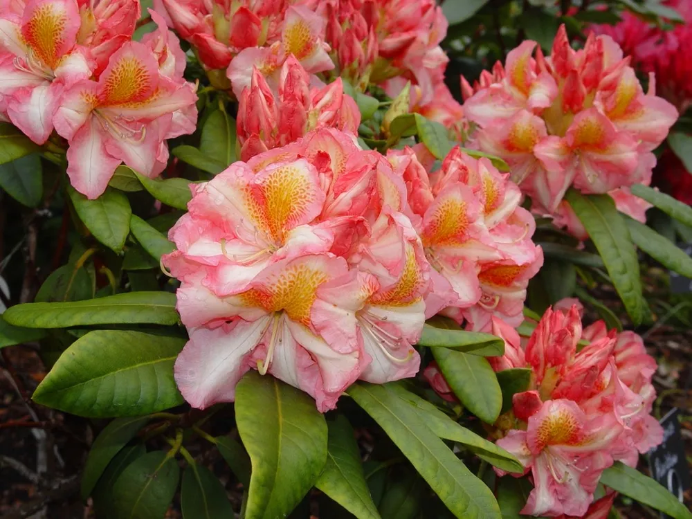 Рододендрон Голдбукетт выделяется среди других сортов своим ярким, двухцветным окрасом цветков.