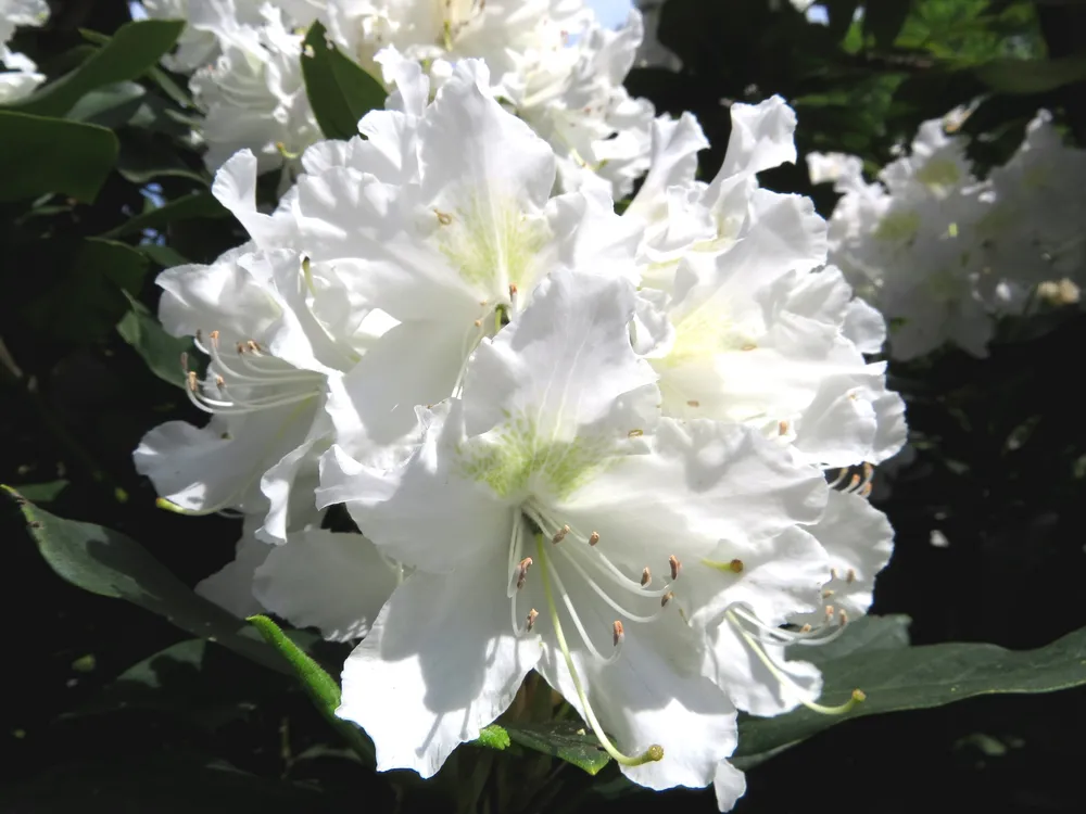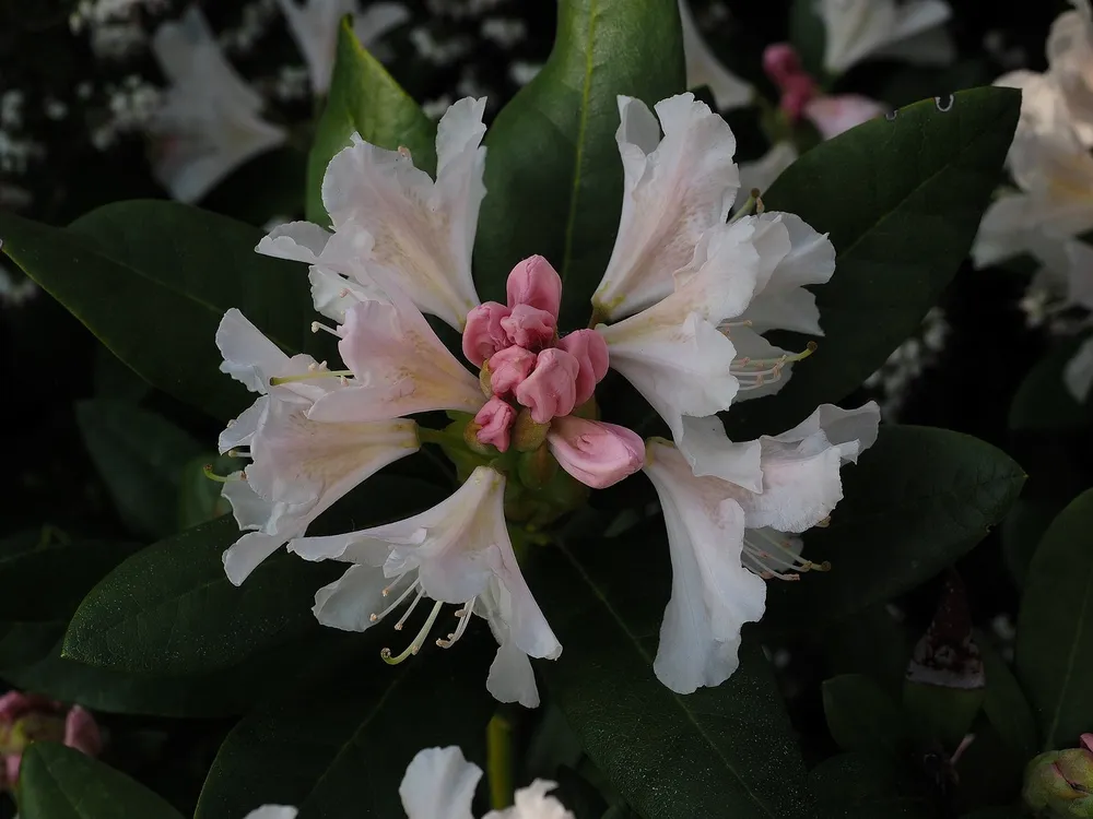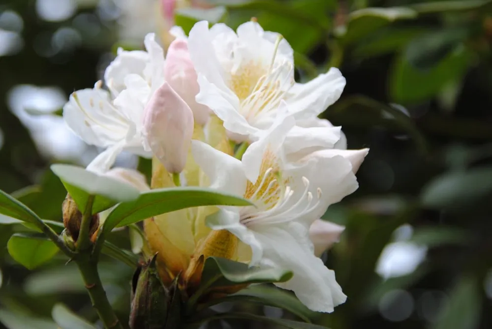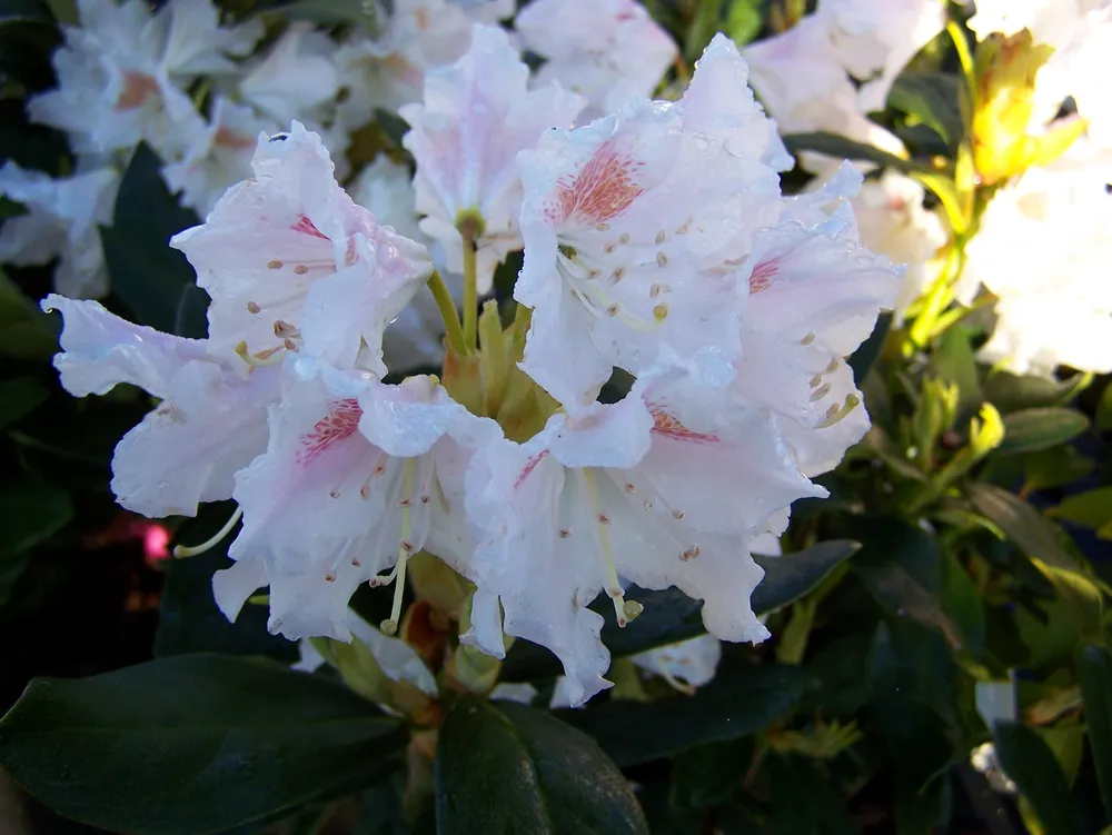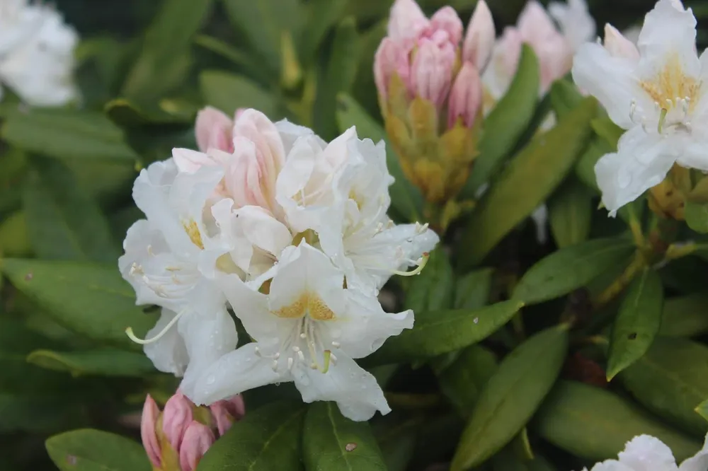 Пур Уайт выделяется среди других сортов рододендронов своими крупными, белоснежными цветками**. Цветы этого сорта отличаются отменной стойкостью к дождю. В то время как многие другие сорта могут поникнуть и потерять форму после дождя, Пур Уайт сохраняет свою красоту.