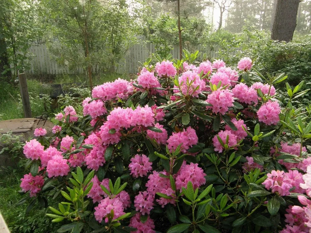 Рододендрон Атлас отличается своими крупными, махровыми цветками пурпурного цвета. В отличие от многих других сортов, он цветет очень обильно и продолжительно – почти весь весенний период.
