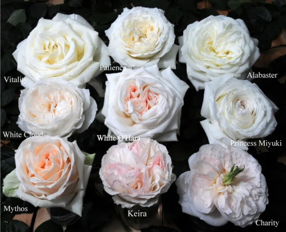 Название сорта произошло от английского слова alabaster, что переводится как «alabaster». Это связано с необычным молочно-белым оттенком лепестков розы Алабастер, который напоминает пористость мрамора. По мере распускания бутон приобретает более кремовый оттенок, а к концу цветения окрас становится нежно-розовым.