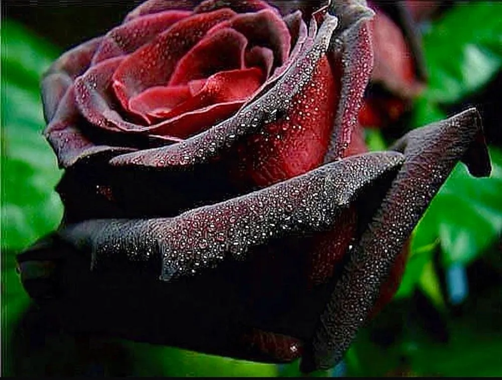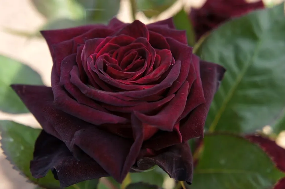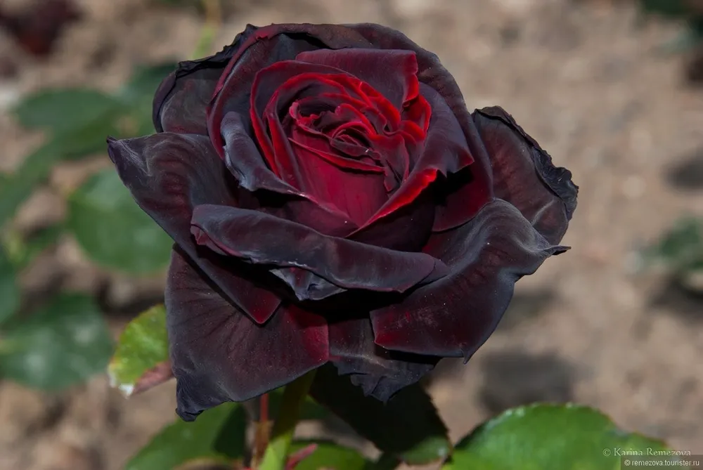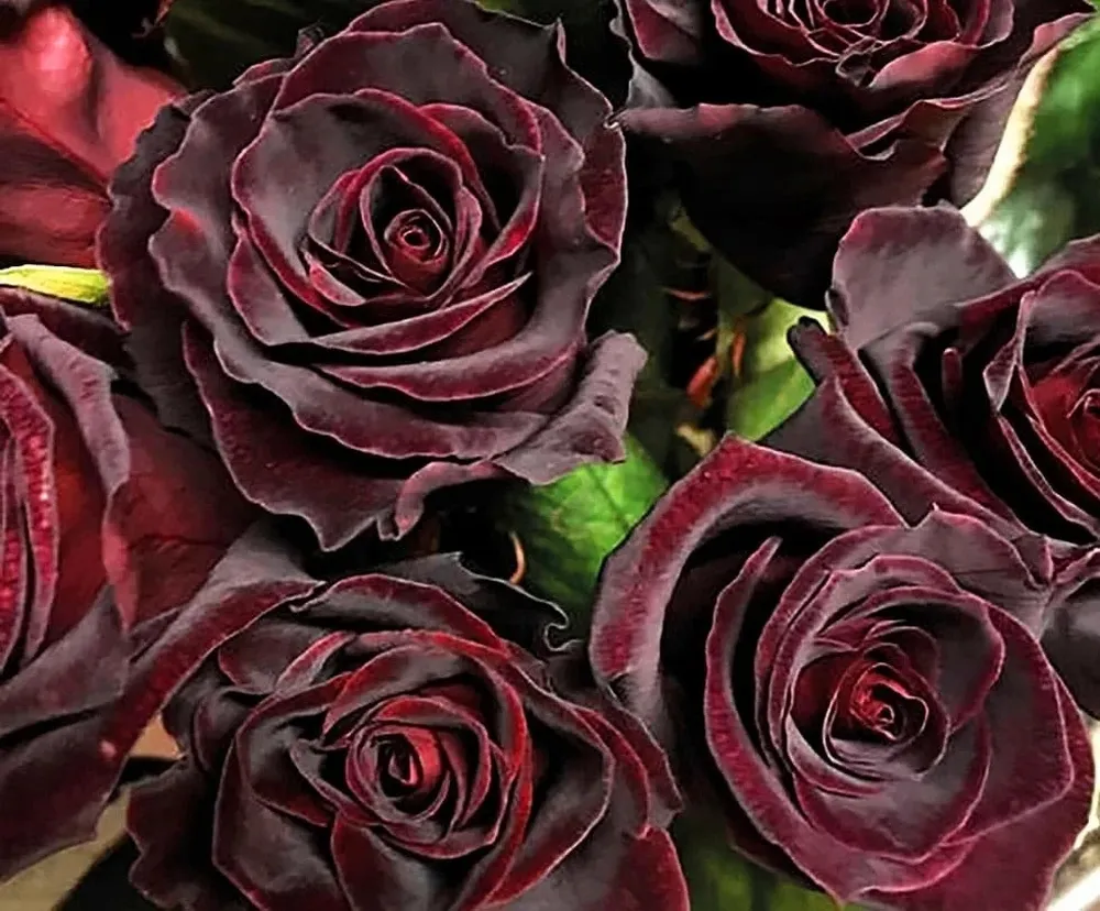 Черный Лебедь отличается глубоким, насыщенным цветом лепестков. Оттенки бутонов варьируются от темно-бордового до почти черного, что создает впечатление таинственности и загадки. Цветы крупные, махровые, с множеством (до 40) лепестков, собранные в соцветия по 3-5 штук. Куст розы Черный Лебедь раскидистый, густой, высотой около 1 метра.