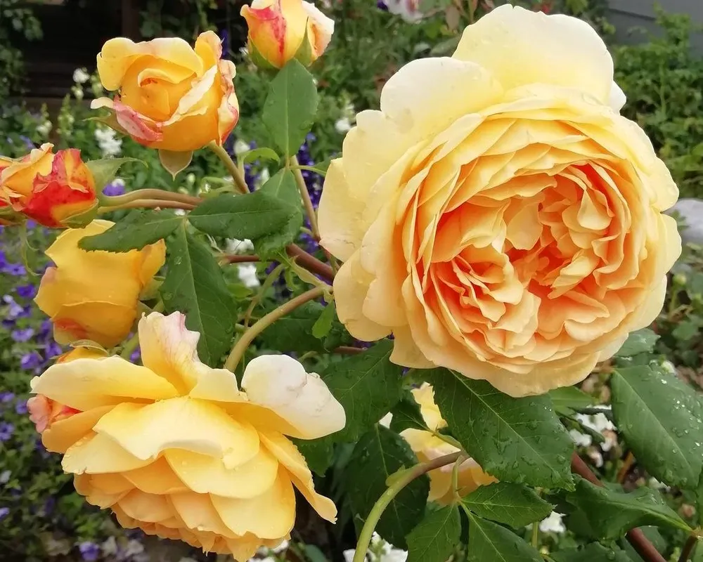 Голден Парфюм – это роза среднего размера, которая может вырасти до 1 метра в высоту и ширину. Куст густой, с множеством шипов. Цветки крупные, махровые, диаметром до 12 см, собраны в соцветия по 3-5 штук. Окраска цветов – яркий золотой цвет, который переливается на солнце, создавая впечатление благородства и роскоши.