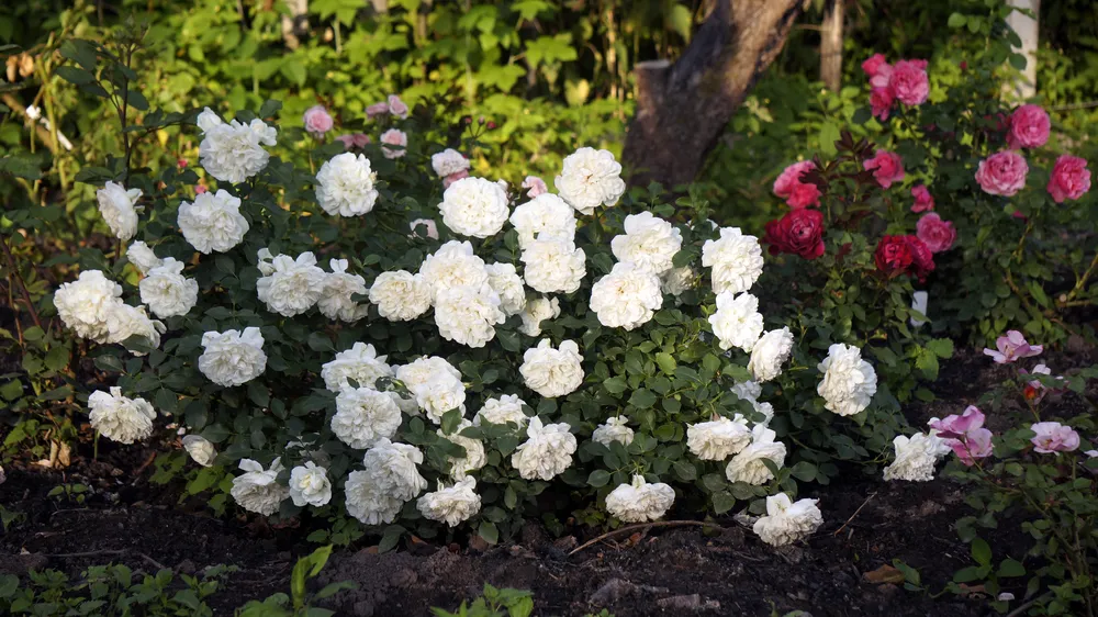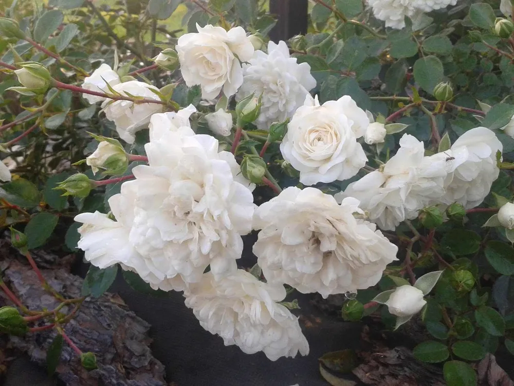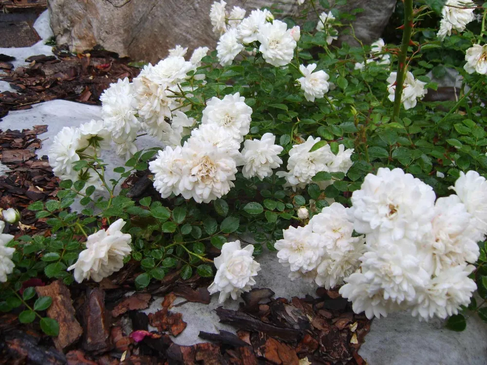 : мульчирование вокруг корней розы Сноуфилд предотвратит испарение влаги и подавление рост сорняков.
