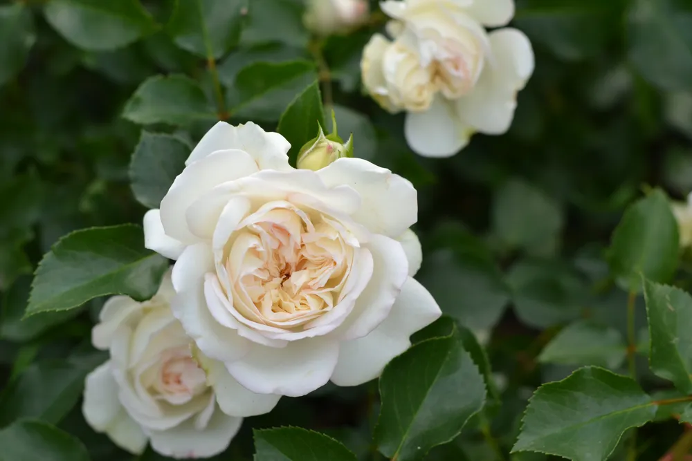 Сноуфилд – это воплощение элегантности и грации. Ее махровые бутоны, насчитывающие до сорока лепестков, окрашены в нежно-кремовый оттенок с легким розовым подтоном. Цветки розы раскрываются медленно, создавая впечатление волнующего танца. Своей пышностью и красотой они напоминают старинные английские сады.