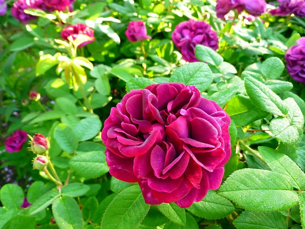 Отличительной чертой розы Тоскана является ее невероятно яркая палитра. Бутоны этой розы раскрываются в виде крупных, махровых цветков с волнистыми лепестками, которые плавно переливаются от насыщенного бордо до глубокого пурпурного цвета. Иногда можно наблюдать и легкий розовый отлив, который придает цветку еще больше очарования.