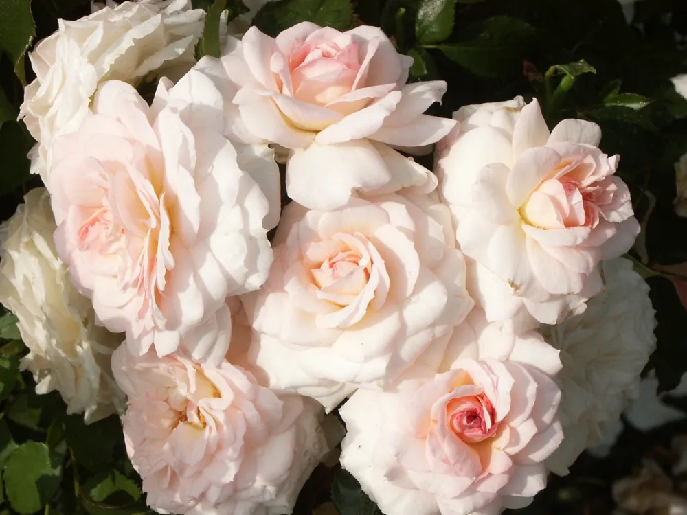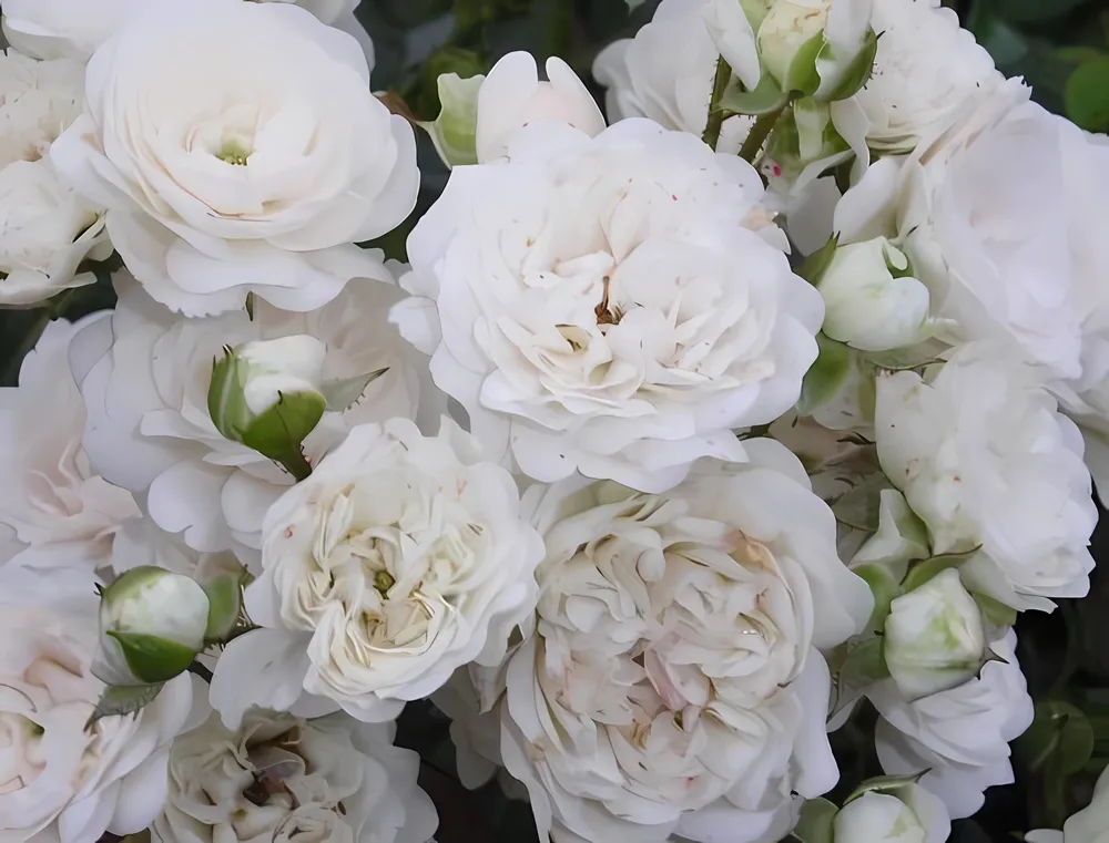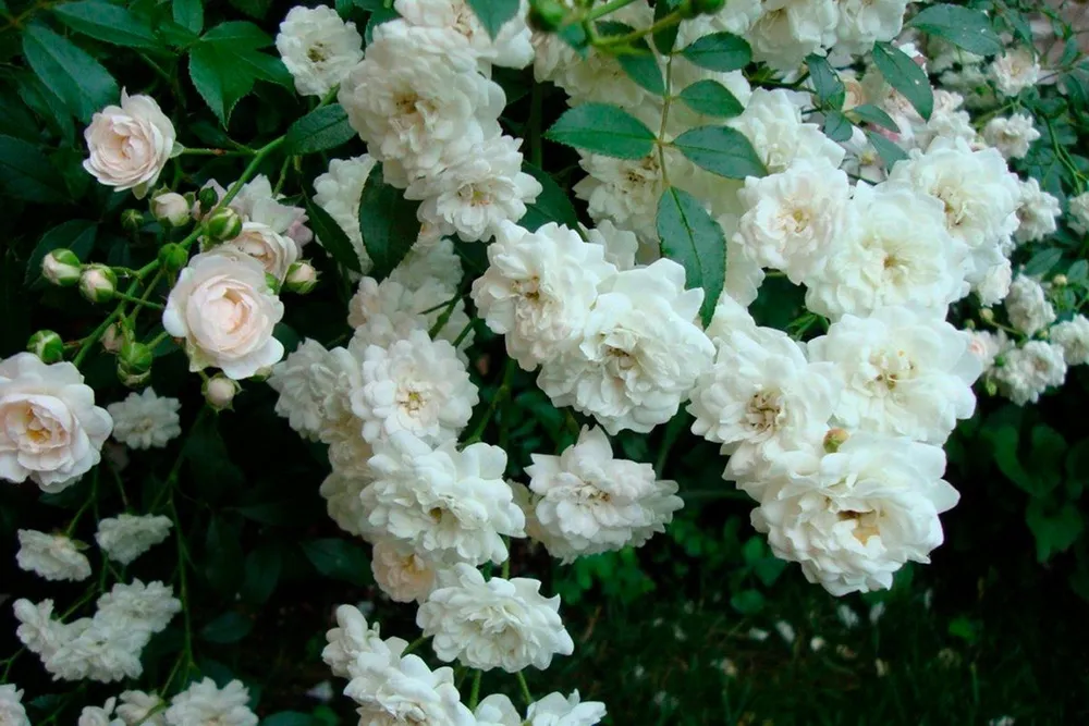 Цветок розы ‘Вайт Фейри’ – это настоящее произведение искусства: махровый, с 40-60 лепестками, кремово-белого цвета с нежным персиковым оттенком. Цветы собраны в соцветия по 3-5 штук и обладают изумительным ароматом, напоминающим свежескошенную траву с нотками ванили и спелых яблок. Высота куста достигает 80-100 см, что позволяет использовать ‘Вайт Фейри’ для оформления клумб, рабаток, бордюров и вертикальных садовых конструкций.