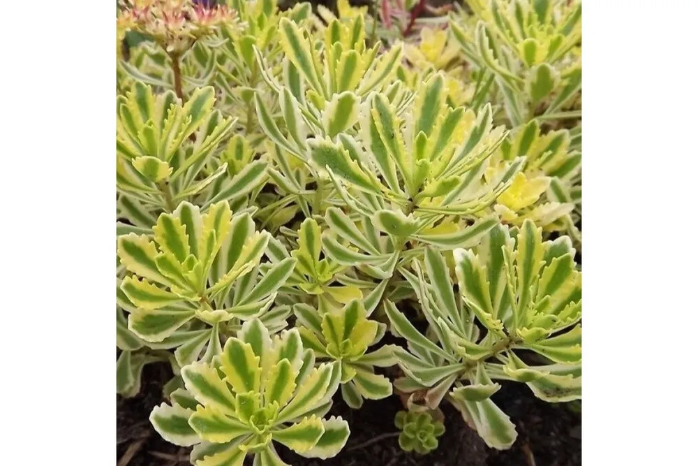 Седум камчатский Вариегатум отличается от других сортов седума пестрыми листьями с белыми или желтыми полосами. В то время как некоторые сорта имеют чисто зеленый окрас, а другие – красную или розовую.