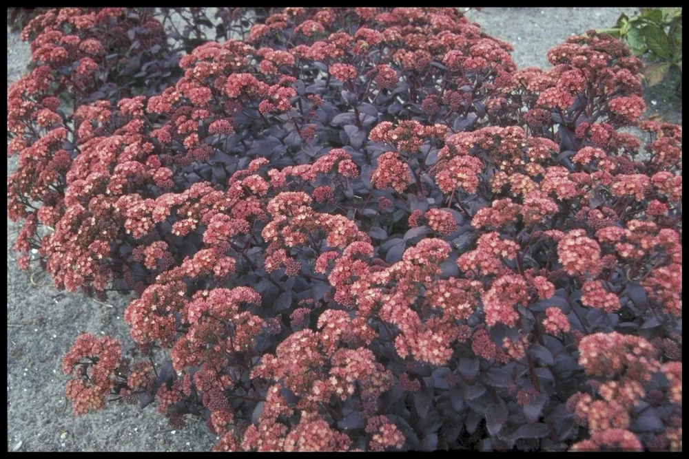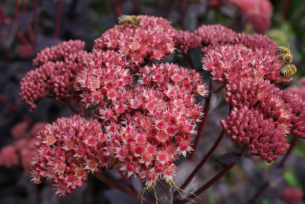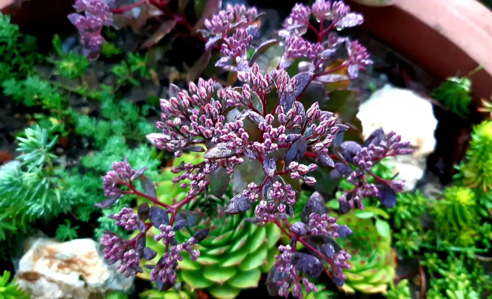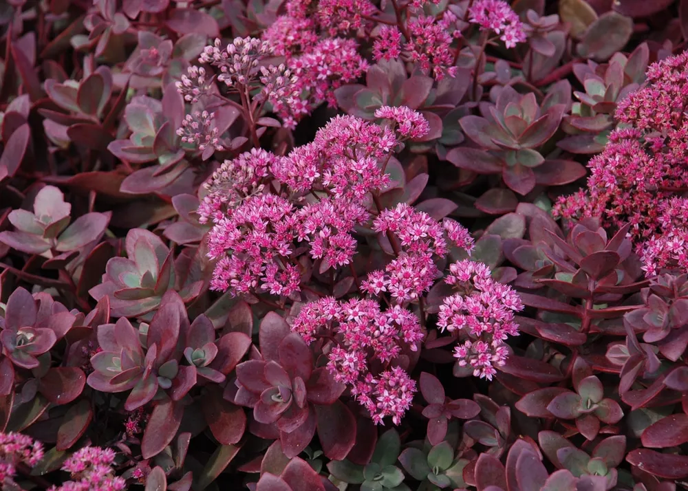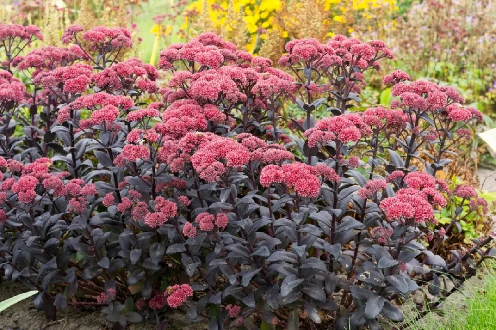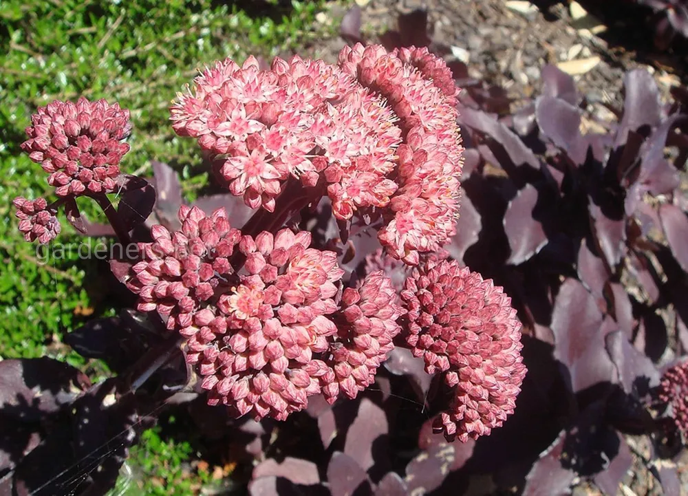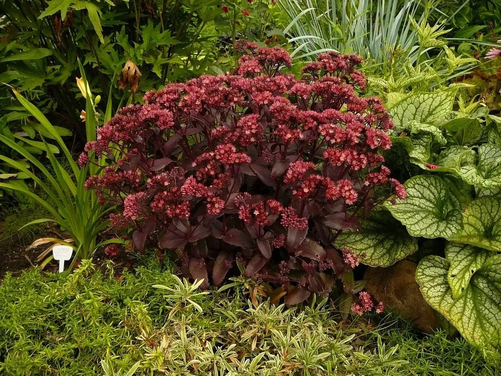 Седум обыкновенный Десерт Блэк выделяется среди других сортов своей темно-черной окраской листьев.