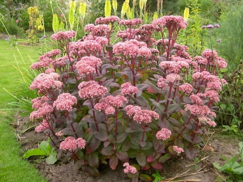 Седум обыкновенный Хербштфройде отличается от других сортов седума более компактным размером куста, мягкими листьями и нежной окраской цветов.