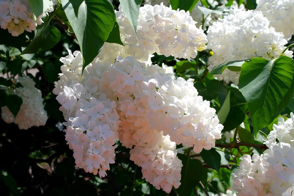 Сирень Примроуз представляет собой компактное деревце высотой около двух метров с густой листвой и пышными соцветиями. Цветки сорта обладают нежно-розовым оттенком с кремовыми бликами, формируя шапки диаметром до 20 сантиметров.