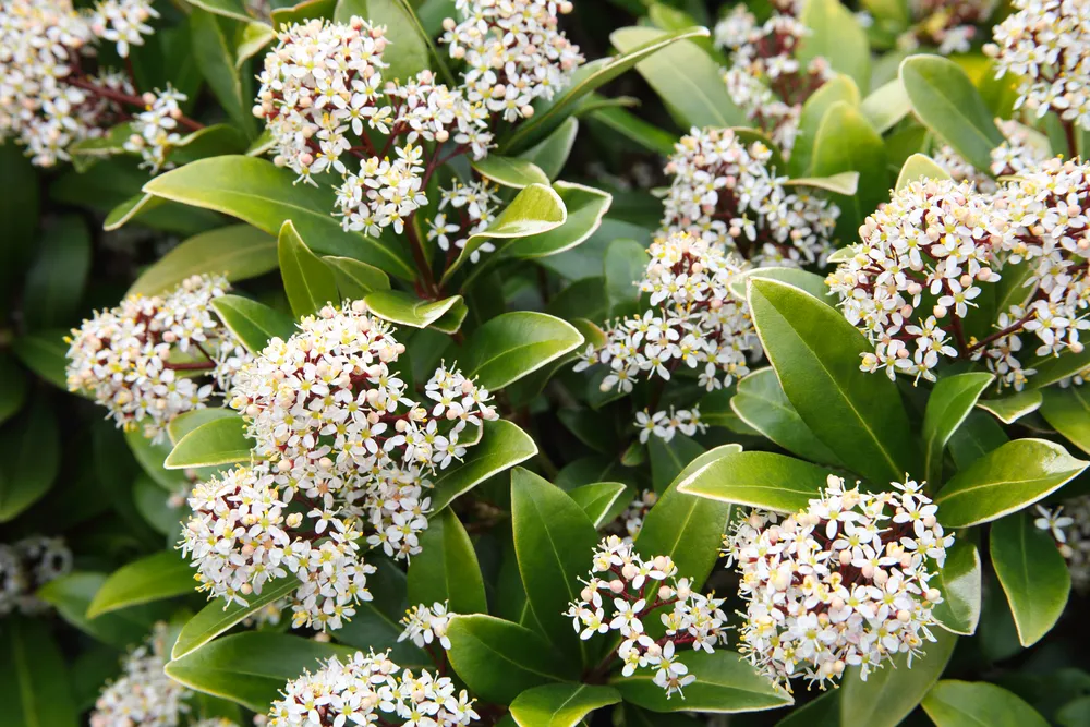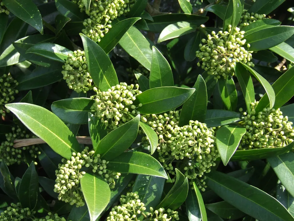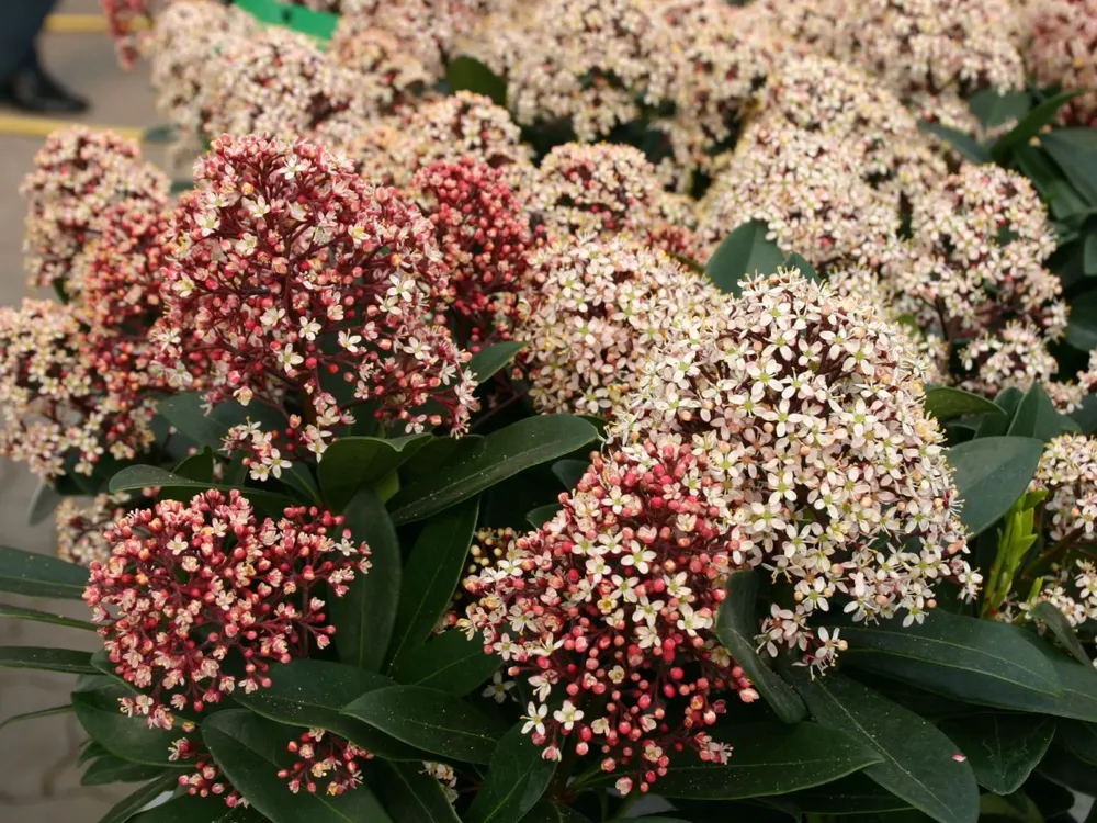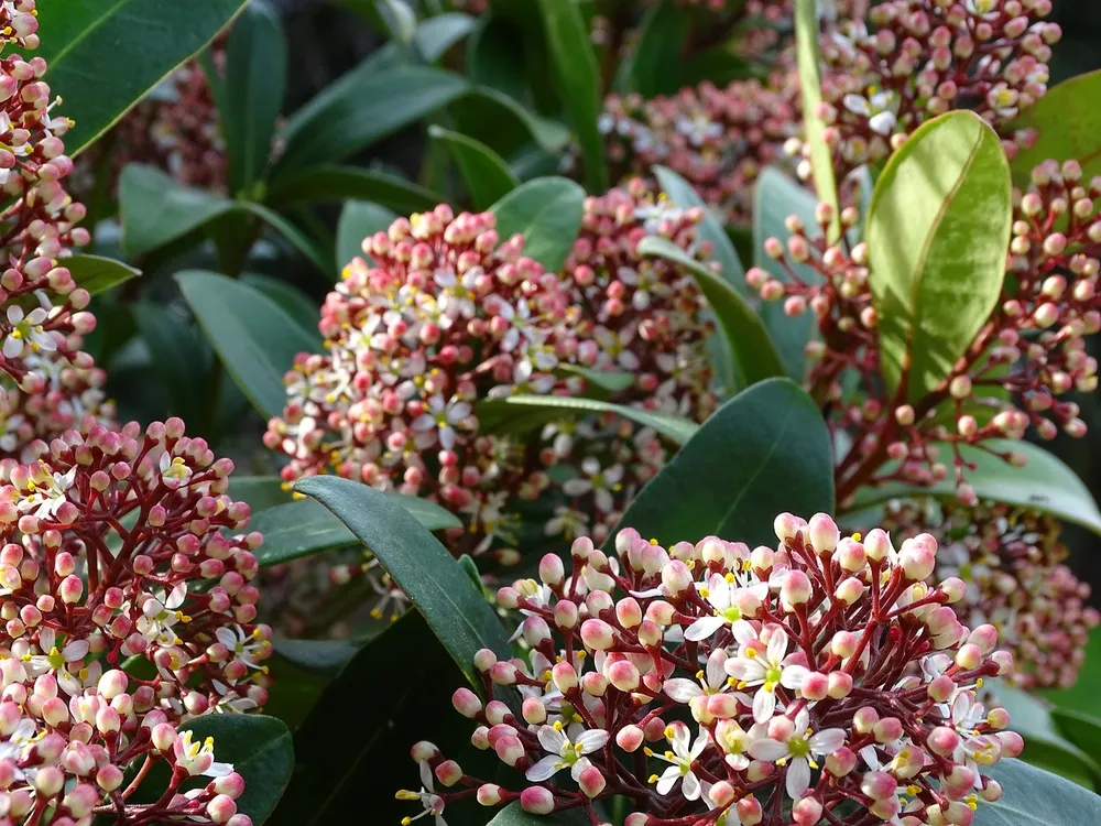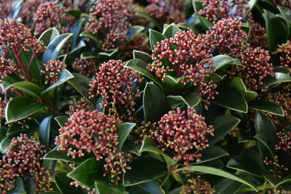 Скиммия – это довольно компактный кустарник, который может достигать в высоту от 1 до 3 метров. Листья у Скиммии плотные, глянцевые, темно-зеленые, а иногда с красными или пурпурными прожилками. В зависимости от сорта, цветы могут быть белыми, розовыми или даже красными.