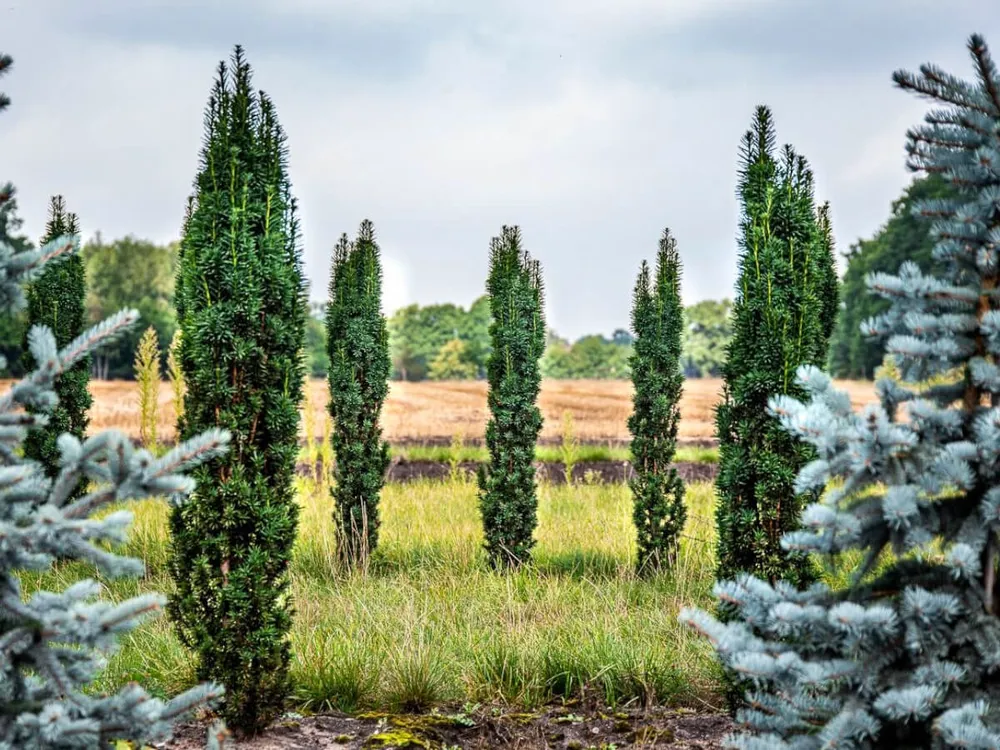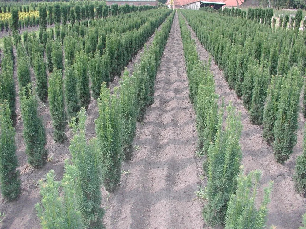 - Тис обыкновенный ‘Бейкер’: колонновидный сорт с узкой, пирамидальной кроной, высота до 6 м.