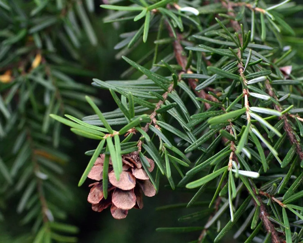 Тсуга западная (Tsuga heterophylla) – вечнозеленое хвойное дерево, произрастающее в Северной Америке. Это элегантный и неприхотливый сорт, который быстро завоевал популярность среди садоводов благодаря своей густой кроне, изящной форме и декоративным качествам. Тсуга западная может достигать внушительных размеров – до 60 метров в высоту и 2-3 метра в диаметре ствола. Это долгожитель: в естественных условиях срок жизни тсуги западной составляет до нескольких веков. Дерево отличается красивой темно-зеленой хвоей, расположенной на ветвях компактно и плотно. Хвоя имеет длину 2-4 см и отдает приятный аромат хвойных деревьев.