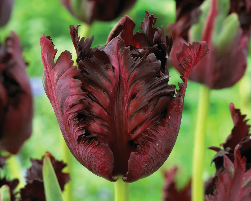 Тюльпан Блэк Пэррот – это необычайно эффектный сорт с глубоким, почти черным окрасом лепестков. Он принадлежит к группе тюльпанов «Паррота», отличающихся своеобразной формой цветка: широко раскрытыми, махровыми лепестками, напоминающими перья попугая. Этот сорт покорил сердца цветоводов своей исключительной красотой и эксклюзивностью.