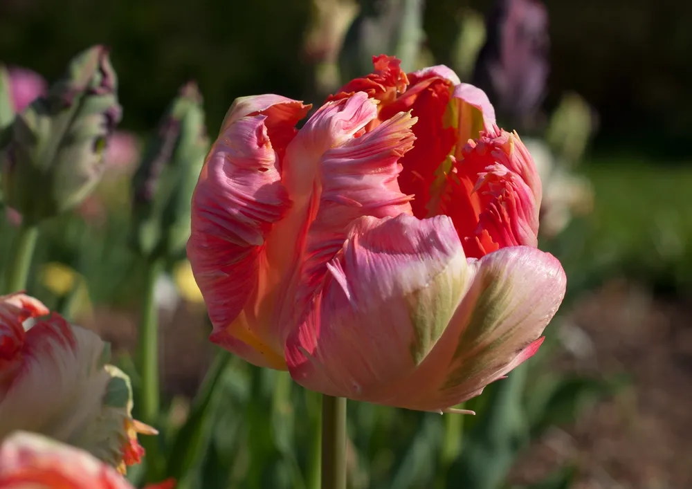 Тюльпан Эмейзинг Пэррот – это поистине уникальный сорт, который покорил сердца садоводов своим необычным окрасом. Он относится к группе тюльпанов « Parrot », которые отличаются оригинальной пестроколорной расцветкой и закрученными лепестками, напоминающими перья попугая. Впервые этот сорт был выведен голландскими селекционерами в начале 21 века и с тех пор стал одним из самых востребованных среди любителей тюльпанов. Эмейзинг Пэррот представляет собой средне-поздний сорт, который цветет в мае-июне. Цветочки достигают высоты около 50 см и обладают махровыми лепестками с ярко выраженным рисунком, напоминающим перья попугая. В центре цветка находится насыщенно-желтый центр, который плавно переходит в яркие малиново-красные и оранжевые лепестки с белыми крапинками. Цветонос у этого сорта крепкий и высотой около 40 см, что позволяет ему без особых проблем противостоять сильным ветрам.