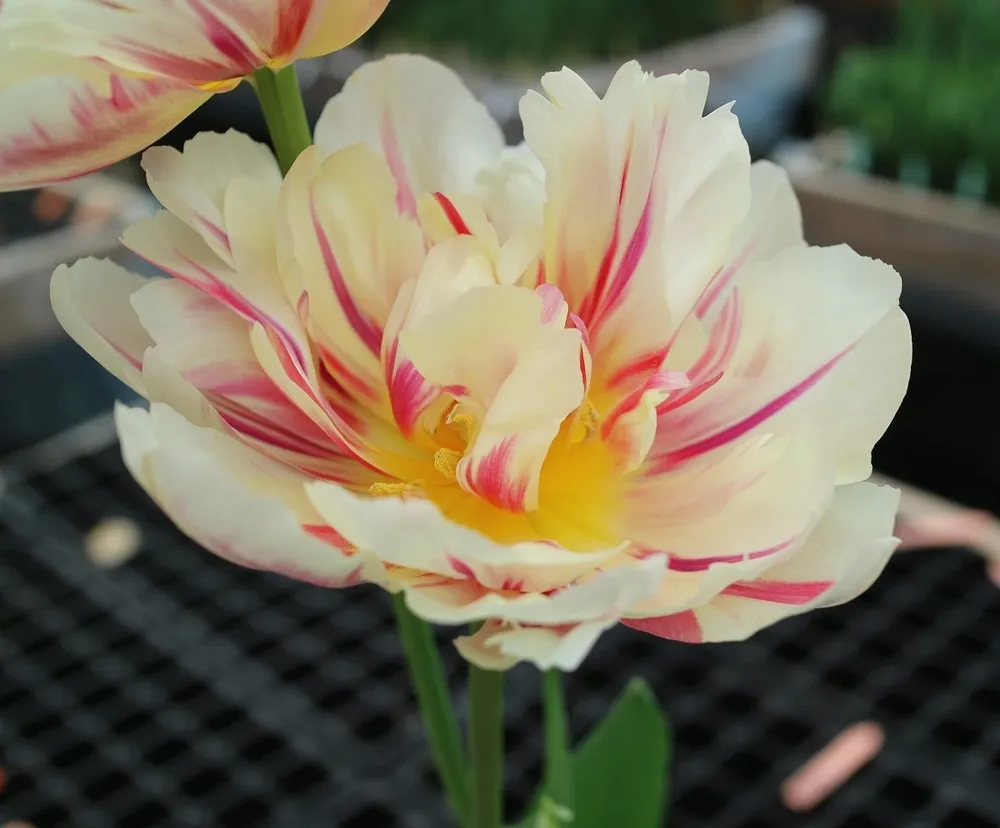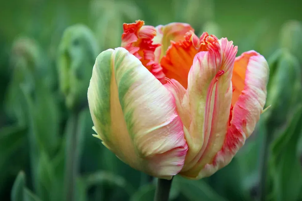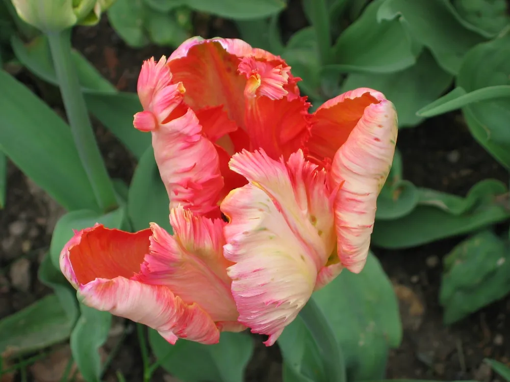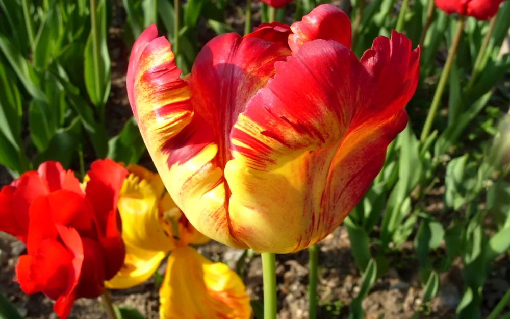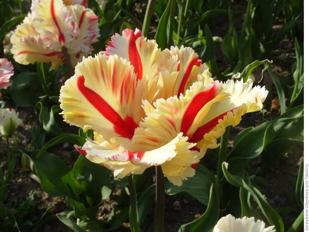 Цветовая палитра Флэминг Пэррот представляет собой удивительное сочетание огненно-красных лепестков с белыми пятнами и прожилками. Благодаря этому он напоминает пернатого друга, что и отражено в названии сорта. Крупные, чашевидные цветы диаметром около 10 см распускаются в середине весны, радуя глаз своим пышным видом.