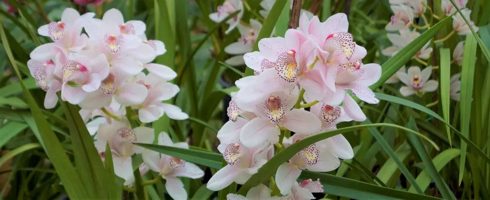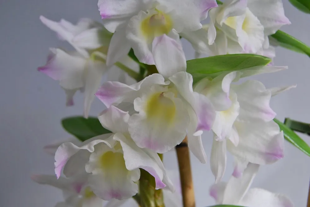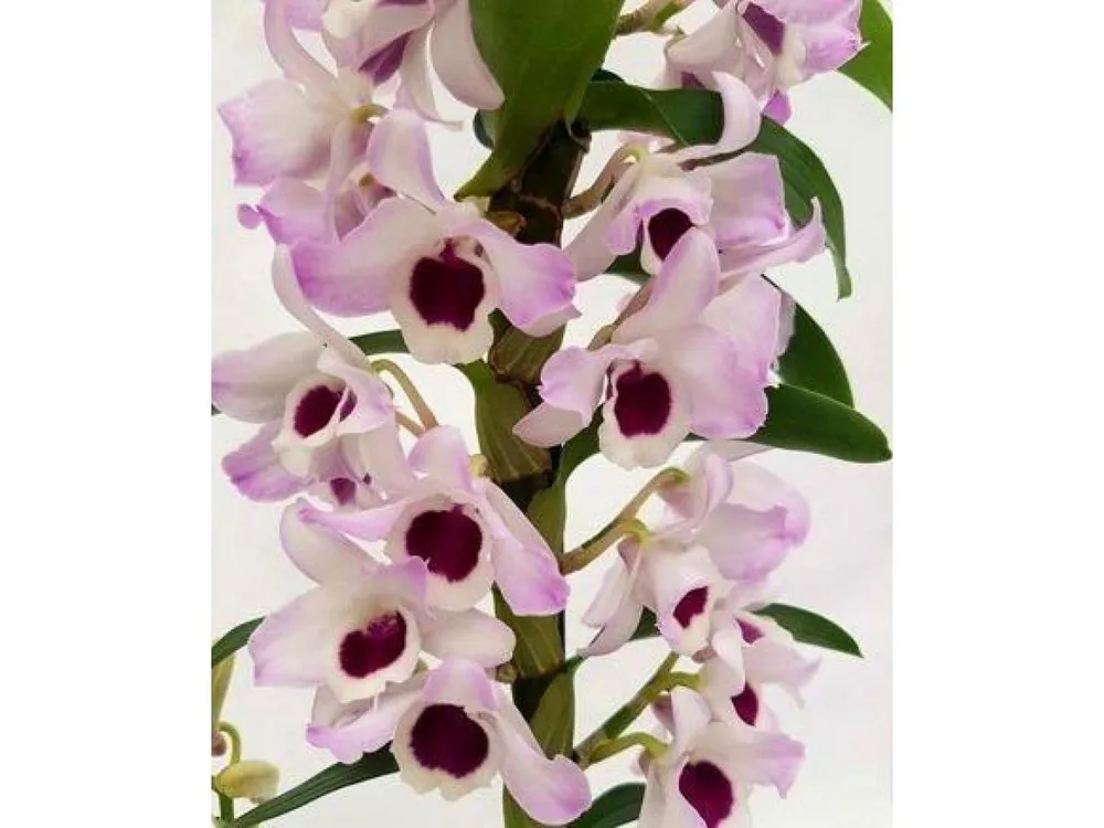 Один из самых популярных видов дендробиума – Дендробиум нобилс. Его родиной считаются восточные регионы Индии, Китая и Японии. Это растение отличается крупными, густыми листьями, которые могут достигать в длину 40-50 см. Цветки собраны в соцветия из 10-20 штук и имеют нежную окраску – от белого до пурпурного с яркими прожилками.