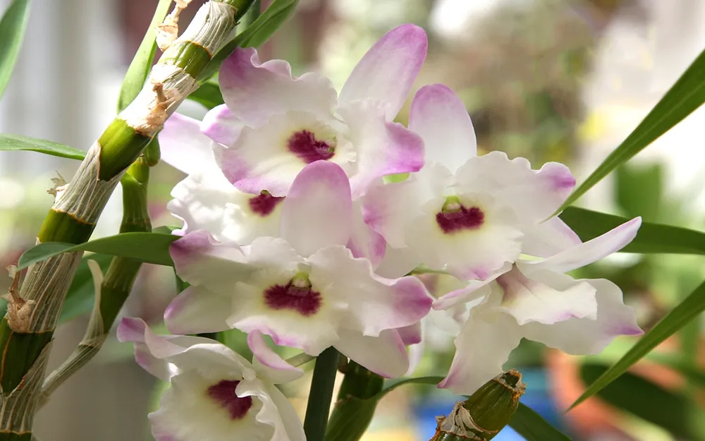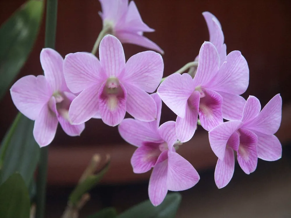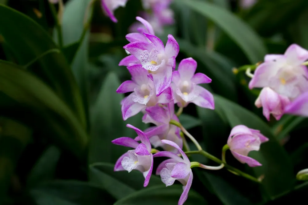 Один из самых популярных видов дендробиума – Дендробиум нобилс. Его родиной считаются восточные регионы Индии, Китая и Японии. Это растение отличается крупными, густыми листьями, которые могут достигать в длину 40-50 см. Цветки собраны в соцветия из 10-20 штук и имеют нежную окраску – от белого до пурпурного с яркими прожилками.