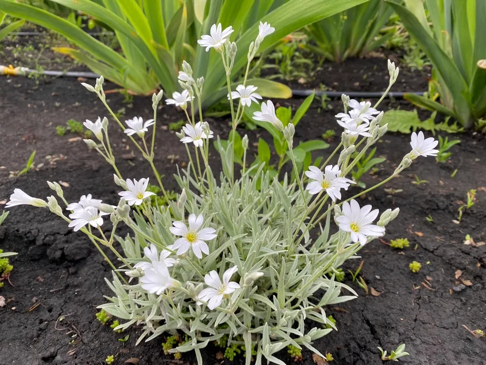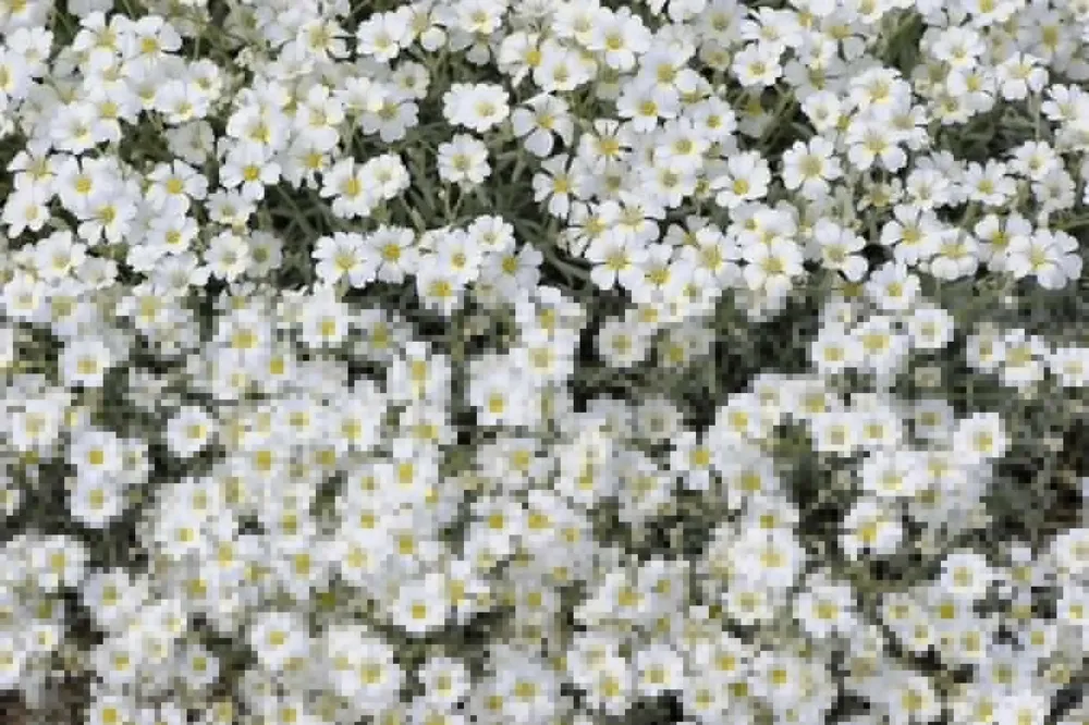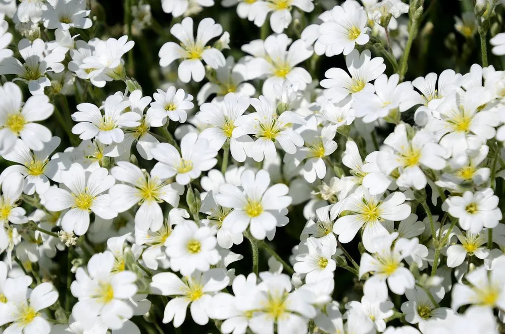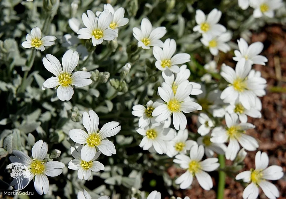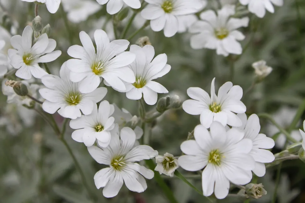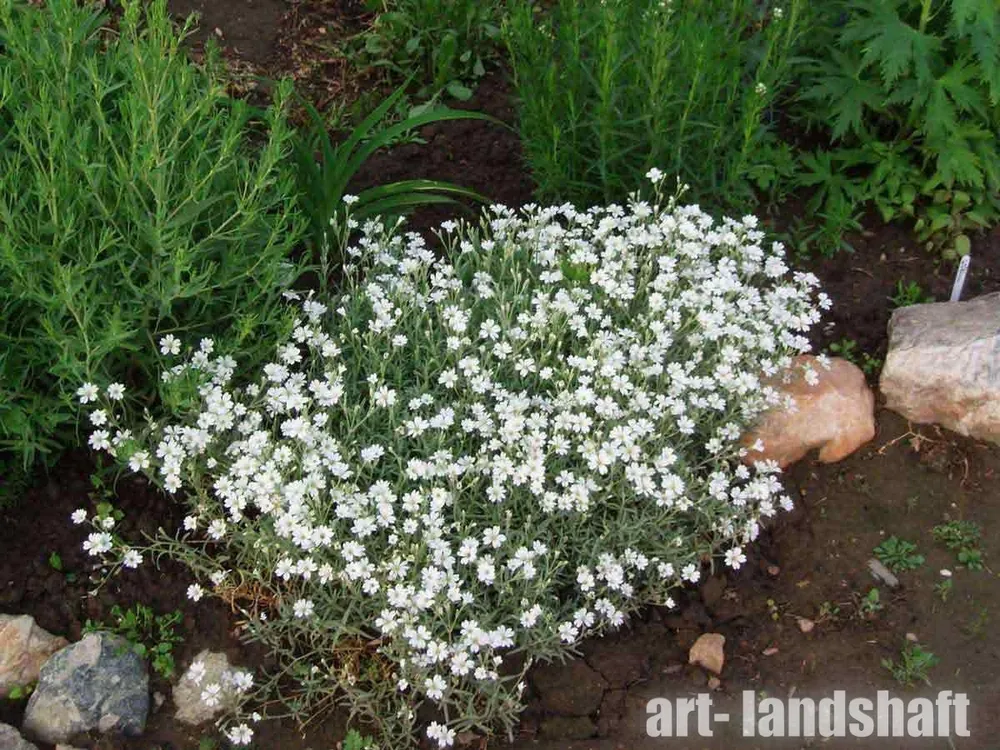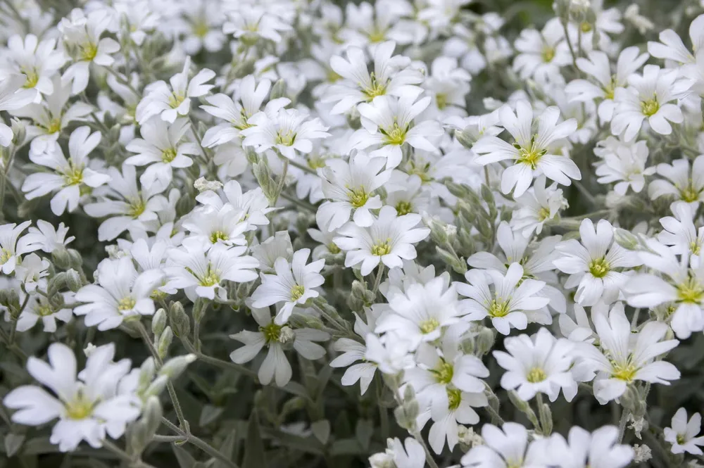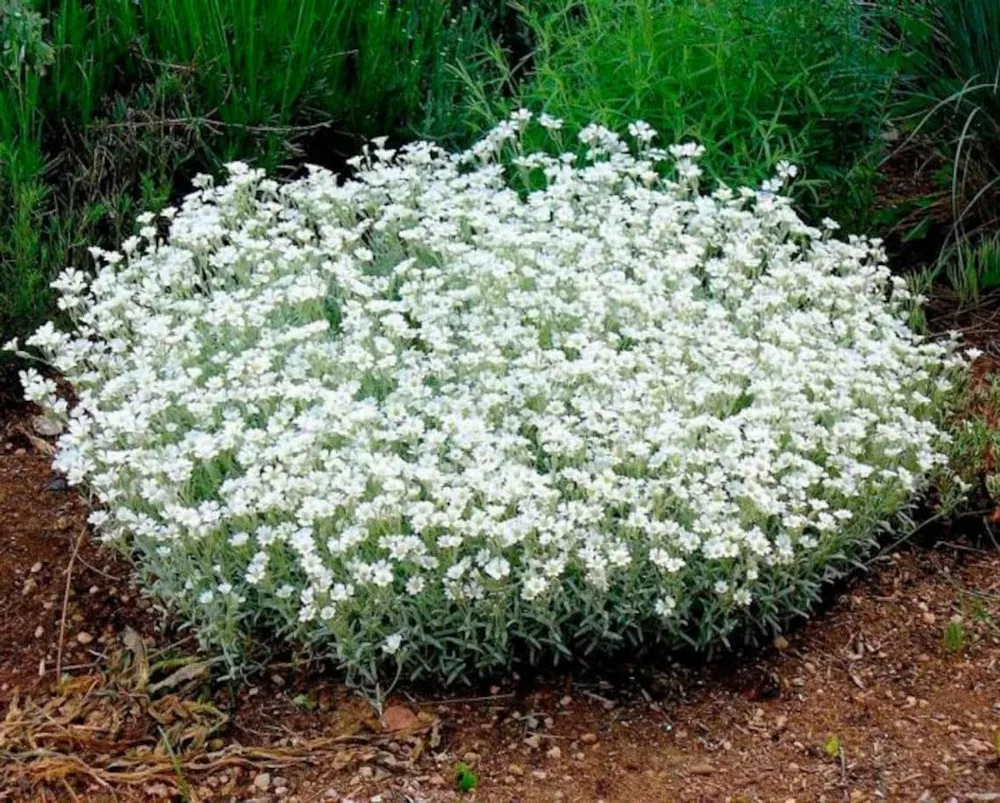 - Церастиум томящее (Cerastium tomentosum) — обладает серебристо-зелеными листьями и обильным белым цветением.