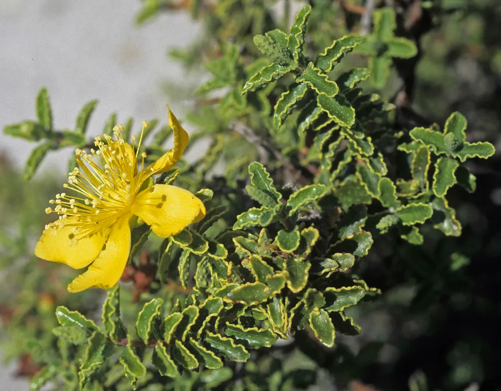 Зверобой чашечковидный – это довольно компактное растение, высота которого не превышает 50-60 см, а диаметр куста достигает около 40 см. Цветки растения обладают необычной формой – они напоминают маленькие чашечки с заостренными краями и окрашены в яркий насыщенный желтый цвет. Цветы зверобоя чашечковидного собраны в небольшие соцветия, что придает кусту пышности и объема.